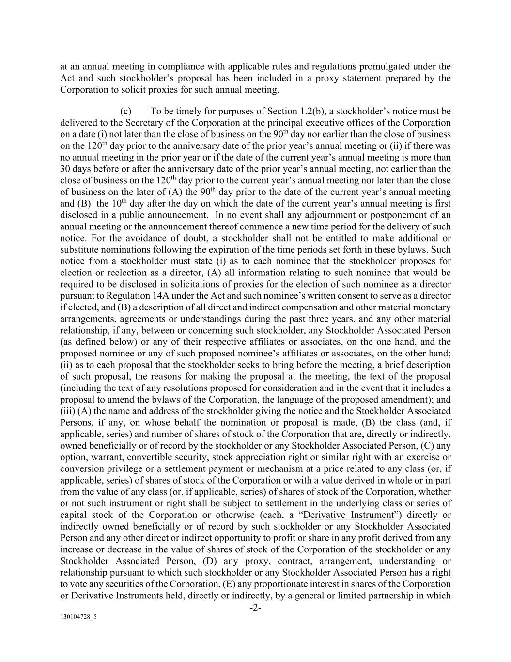 -2- 130104728_5 at an annual meeting in compliance with applicable rules and regulations promulgated under the Act and such stockholder’s proposal has been included in a proxy statement prepared by the Corporation to solicit proxies for such annual meeting. (c) To be timely for purposes of Section 1.2(b), a stockholder’s notice must be delivered to the Secretary of the Corporation at the principal executive offices of the Corporation on a date (i) not later than the close of business on the 90th day nor earlier than the close of business on the 120th day prior to the anniversary date of the prior year’s annual meeting or (ii) if there was no annual meeting in the prior year or if the date of the current year’s annual meeting is more than 30 days before or after the anniversary date of the prior year’s annual meeting, not earlier than the close of business on the 120th day prior to the current year’s annual meeting nor later than the close of business on the later of (A) the 90th day prior to the date of the current year’s annual meeting and (B) the 10th day after the day on which the date of the current year’s annual meeting is first disclosed in a public announcement. In no event shall any adjournment or postponement of an annual meeting or the announcement thereof commence a new time period for the delivery of such notice. For the avoidance of doubt, a stockholder shall not be entitled to make additional or substitute nominations following the expiration of the time periods set forth in these bylaws. Such notice from a stockholder must state (i) as to each nominee that the stockholder proposes for election or reelection as a director, (A) all information relating to such nominee that would be required to be disclosed in solicitations of proxies for the election of such nominee as a director pursuant to Regulation 14A under the Act and such nominee’s written consent to serve as a director if elected, and (B) a description of all direct and indirect compensation and other material monetary arrangements, agreements or understandings during the past three years, and any other material relationship, if any, between or concerning such stockholder, any Stockholder Associated Person (as defined below) or any of their respective affiliates or associates, on the one hand, and the proposed nominee or any of such proposed nominee’s affiliates or associates, on the other hand; (ii) as to each proposal that the stockholder seeks to bring before the meeting, a brief description of such proposal, the reasons for making the proposal at the meeting, the text of the proposal (including the text of any resolutions proposed for consideration and in the event that it includes a proposal to amend the bylaws of the Corporation, the language of the proposed amendment); and (iii) (A) the name and address of the stockholder giving the notice and the Stockholder Associated Persons, if any, on whose behalf the nomination or proposal is made, (B) the class (and, if applicable, series) and number of shares of stock of the Corporation that are, directly or indirectly, owned beneficially or of record by the stockholder or any Stockholder Associated Person, (C) any option, warrant, convertible security, stock appreciation right or similar right with an exercise or conversion privilege or a settlement payment or mechanism at a price related to any class (or, if applicable, series) of shares of stock of the Corporation or with a value derived in whole or in part from the value of any class (or, if applicable, series) of shares of stock of the Corporation, whether or not such instrument or right shall be subject to settlement in the underlying class or series of capital stock of the Corporation or otherwise (each, a “Derivative Instrument”) directly or indirectly owned beneficially or of record by such stockholder or any Stockholder Associated Person and any other direct or indirect opportunity to profit or share in any profit derived from any increase or decrease in the value of shares of stock of the Corporation of the stockholder or any Stockholder Associated Person, (D) any proxy, contract, arrangement, understanding or relationship pursuant to which such stockholder or any Stockholder Associated Person has a right to vote any securities of the Corporation, (E) any proportionate interest in shares of the Corporation or Derivative Instruments held, directly or indirectly, by a general or limited partnership in which