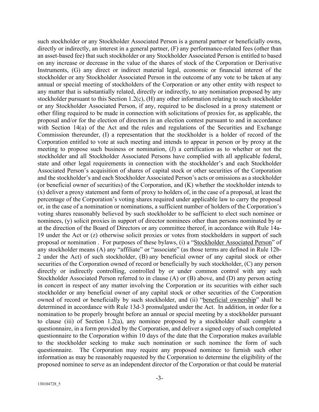 -3- 130104728_5 such stockholder or any Stockholder Associated Person is a general partner or beneficially owns, directly or indirectly, an interest in a general partner, (F) any performance-related fees (other than an asset-based fee) that such stockholder or any Stockholder Associated Person is entitled to based on any increase or decrease in the value of the shares of stock of the Corporation or Derivative Instruments, (G) any direct or indirect material legal, economic or financial interest of the stockholder or any Stockholder Associated Person in the outcome of any vote to be taken at any annual or special meeting of stockholders of the Corporation or any other entity with respect to any matter that is substantially related, directly or indirectly, to any nomination proposed by any stockholder pursuant to this Section 1.2(c), (H) any other information relating to such stockholder or any Stockholder Associated Person, if any, required to be disclosed in a proxy statement or other filing required to be made in connection with solicitations of proxies for, as applicable, the proposal and/or for the election of directors in an election contest pursuant to and in accordance with Section 14(a) of the Act and the rules and regulations of the Securities and Exchange Commission thereunder, (I) a representation that the stockholder is a holder of record of the Corporation entitled to vote at such meeting and intends to appear in person or by proxy at the meeting to propose such business or nomination, (J) a certification as to whether or not the stockholder and all Stockholder Associated Persons have complied with all applicable federal, state and other legal requirements in connection with the stockholder’s and each Stockholder Associated Person’s acquisition of shares of capital stock or other securities of the Corporation and the stockholder’s and each Stockholder Associated Person’s acts or omissions as a stockholder (or beneficial owner of securities) of the Corporation, and (K) whether the stockholder intends to (x) deliver a proxy statement and form of proxy to holders of, in the case of a proposal, at least the percentage of the Corporation’s voting shares required under applicable law to carry the proposal or, in the case of a nomination or nominations, a sufficient number of holders of the Corporation’s voting shares reasonably believed by such stockholder to be sufficient to elect such nominee or nominees, (y) solicit proxies in support of director nominees other than persons nominated by or at the direction of the Board of Directors or any committee thereof, in accordance with Rule 14a- 19 under the Act or (z) otherwise solicit proxies or votes from stockholders in support of such proposal or nomination . For purposes of these bylaws, (i) a “Stockholder Associated Person” of any stockholder means (A) any “affiliate” or “associate” (as those terms are defined in Rule 12b- 2 under the Act) of such stockholder, (B) any beneficial owner of any capital stock or other securities of the Corporation owned of record or beneficially by such stockholder, (C) any person directly or indirectly controlling, controlled by or under common control with any such Stockholder Associated Person referred to in clause (A) or (B) above, and (D) any person acting in concert in respect of any matter involving the Corporation or its securities with either such stockholder or any beneficial owner of any capital stock or other securities of the Corporation owned of record or beneficially by such stockholder, and (ii) “beneficial ownership” shall be determined in accordance with Rule 13d-3 promulgated under the Act. In addition, in order for a nomination to be properly brought before an annual or special meeting by a stockholder pursuant to clause (iii) of Section 1.2(a), any nominee proposed by a stockholder shall complete a questionnaire, in a form provided by the Corporation, and deliver a signed copy of such completed questionnaire to the Corporation within 10 days of the date that the Corporation makes available to the stockholder seeking to make such nomination or such nominee the form of such questionnaire. The Corporation may require any proposed nominee to furnish such other information as may be reasonably requested by the Corporation to determine the eligibility of the proposed nominee to serve as an independent director of the Corporation or that could be material