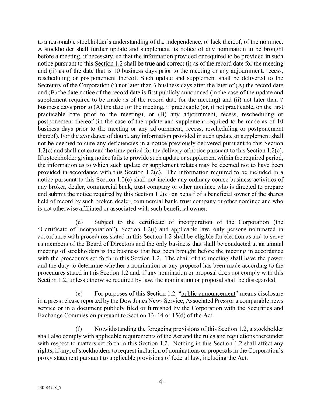 -4- 130104728_5 to a reasonable stockholder’s understanding of the independence, or lack thereof, of the nominee. A stockholder shall further update and supplement its notice of any nomination to be brought before a meeting, if necessary, so that the information provided or required to be provided in such notice pursuant to this Section 1.2 shall be true and correct (i) as of the record date for the meeting and (ii) as of the date that is 10 business days prior to the meeting or any adjournment, recess, rescheduling or postponement thereof. Such update and supplement shall be delivered to the Secretary of the Corporation (i) not later than 3 business days after the later of (A) the record date and (B) the date notice of the record date is first publicly announced (in the case of the update and supplement required to be made as of the record date for the meeting) and (ii) not later than 7 business days prior to (A) the date for the meeting, if practicable (or, if not practicable, on the first practicable date prior to the meeting), or (B) any adjournment, recess, rescheduling or postponement thereof (in the case of the update and supplement required to be made as of 10 business days prior to the meeting or any adjournment, recess, rescheduling or postponement thereof). For the avoidance of doubt, any information provided in such update or supplement shall not be deemed to cure any deficiencies in a notice previously delivered pursuant to this Section 1.2(c) and shall not extend the time period for the delivery of notice pursuant to this Section 1.2(c). If a stockholder giving notice fails to provide such update or supplement within the required period, the information as to which such update or supplement relates may be deemed not to have been provided in accordance with this Section 1.2(c). The information required to be included in a notice pursuant to this Section 1.2(c) shall not include any ordinary course business activities of any broker, dealer, commercial bank, trust company or other nominee who is directed to prepare and submit the notice required by this Section 1.2(c) on behalf of a beneficial owner of the shares held of record by such broker, dealer, commercial bank, trust company or other nominee and who is not otherwise affiliated or associated with such beneficial owner. (d) Subject to the certificate of incorporation of the Corporation (the “Certificate of Incorporation”), Section 1.2(i) and applicable law, only persons nominated in accordance with procedures stated in this Section 1.2 shall be eligible for election as and to serve as members of the Board of Directors and the only business that shall be conducted at an annual meeting of stockholders is the business that has been brought before the meeting in accordance with the procedures set forth in this Section 1.2. The chair of the meeting shall have the power and the duty to determine whether a nomination or any proposal has been made according to the procedures stated in this Section 1.2 and, if any nomination or proposal does not comply with this Section 1.2, unless otherwise required by law, the nomination or proposal shall be disregarded. (e) For purposes of this Section 1.2, “public announcement” means disclosure in a press release reported by the Dow Jones News Service, Associated Press or a comparable news service or in a document publicly filed or furnished by the Corporation with the Securities and Exchange Commission pursuant to Section 13, 14 or 15(d) of the Act. (f) Notwithstanding the foregoing provisions of this Section 1.2, a stockholder shall also comply with applicable requirements of the Act and the rules and regulations thereunder with respect to matters set forth in this Section 1.2. Nothing in this Section 1.2 shall affect any rights, if any, of stockholders to request inclusion of nominations or proposals in the Corporation’s proxy statement pursuant to applicable provisions of federal law, including the Act.