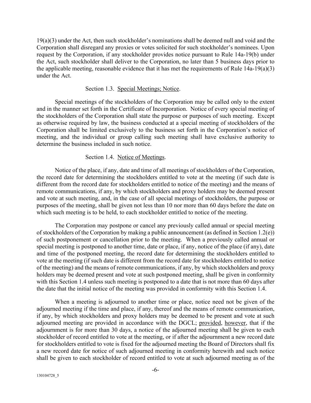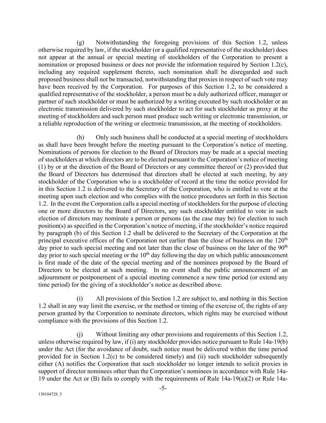 -5- 130104728_5 (g) Notwithstanding the foregoing provisions of this Section 1.2, unless otherwise required by law, if the stockholder (or a qualified representative of the stockholder) does not appear at the annual or special meeting of stockholders of the Corporation to present a nomination or proposed business or does not provide the information required by Section 1.2(c), including any required supplement thereto, such nomination shall be disregarded and such proposed business shall not be transacted, notwithstanding that proxies in respect of such vote may have been received by the Corporation. For purposes of this Section 1.2, to be considered a qualified representative of the stockholder, a person must be a duly authorized officer, manager or partner of such stockholder or must be authorized by a writing executed by such stockholder or an electronic transmission delivered by such stockholder to act for such stockholder as proxy at the meeting of stockholders and such person must produce such writing or electronic transmission, or a reliable reproduction of the writing or electronic transmission, at the meeting of stockholders. (h) Only such business shall be conducted at a special meeting of stockholders as shall have been brought before the meeting pursuant to the Corporation’s notice of meeting. Nominations of persons for election to the Board of Directors may be made at a special meeting of stockholders at which directors are to be elected pursuant to the Corporation’s notice of meeting (1) by or at the direction of the Board of Directors or any committee thereof or (2) provided that the Board of Directors has determined that directors shall be elected at such meeting, by any stockholder of the Corporation who is a stockholder of record at the time the notice provided for in this Section 1.2 is delivered to the Secretary of the Corporation, who is entitled to vote at the meeting upon such election and who complies with the notice procedures set forth in this Section 1.2. In the event the Corporation calls a special meeting of stockholders for the purpose of electing one or more directors to the Board of Directors, any such stockholder entitled to vote in such election of directors may nominate a person or persons (as the case may be) for election to such position(s) as specified in the Corporation’s notice of meeting, if the stockholder’s notice required by paragraph (b) of this Section 1.2 shall be delivered to the Secretary of the Corporation at the principal executive offices of the Corporation not earlier than the close of business on the 120th day prior to such special meeting and not later than the close of business on the later of the 90th day prior to such special meeting or the 10th day following the day on which public announcement is first made of the date of the special meeting and of the nominees proposed by the Board of Directors to be elected at such meeting. In no event shall the public announcement of an adjournment or postponement of a special meeting commence a new time period (or extend any time period) for the giving of a stockholder’s notice as described above. (i) All provisions of this Section 1.2 are subject to, and nothing in this Section 1.2 shall in any way limit the exercise, or the method or timing of the exercise of, the rights of any person granted by the Corporation to nominate directors, which rights may be exercised without compliance with the provisions of this Section 1.2. (j) Without limiting any other provisions and requirements of this Section 1.2, unless otherwise required by law, if (i) any stockholder provides notice pursuant to Rule 14a-19(b) under the Act (for the avoidance of doubt, such notice must be delivered within the time period provided for in Section 1.2(c) to be considered timely) and (ii) such stockholder subsequently either (A) notifies the Corporation that such stockholder no longer intends to solicit proxies in support of director nominees other than the Corporation’s nominees in accordance with Rule 14a- 19 under the Act or (B) fails to comply with the requirements of Rule 14a-19(a)(2) or Rule 14a-