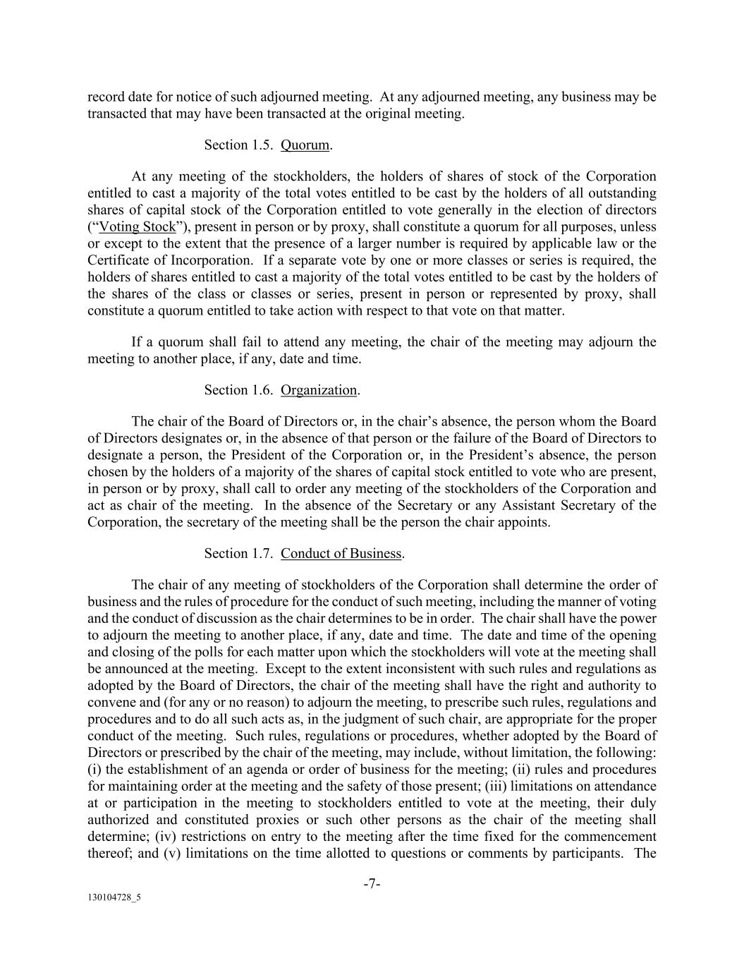 -7- 130104728_5 record date for notice of such adjourned meeting. At any adjourned meeting, any business may be transacted that may have been transacted at the original meeting. Section 1.5. Quorum. At any meeting of the stockholders, the holders of shares of stock of the Corporation entitled to cast a majority of the total votes entitled to be cast by the holders of all outstanding shares of capital stock of the Corporation entitled to vote generally in the election of directors (“Voting Stock”), present in person or by proxy, shall constitute a quorum for all purposes, unless or except to the extent that the presence of a larger number is required by applicable law or the Certificate of Incorporation. If a separate vote by one or more classes or series is required, the holders of shares entitled to cast a majority of the total votes entitled to be cast by the holders of the shares of the class or classes or series, present in person or represented by proxy, shall constitute a quorum entitled to take action with respect to that vote on that matter. If a quorum shall fail to attend any meeting, the chair of the meeting may adjourn the meeting to another place, if any, date and time. Section 1.6. Organization. The chair of the Board of Directors or, in the chair’s absence, the person whom the Board of Directors designates or, in the absence of that person or the failure of the Board of Directors to designate a person, the President of the Corporation or, in the President’s absence, the person chosen by the holders of a majority of the shares of capital stock entitled to vote who are present, in person or by proxy, shall call to order any meeting of the stockholders of the Corporation and act as chair of the meeting. In the absence of the Secretary or any Assistant Secretary of the Corporation, the secretary of the meeting shall be the person the chair appoints. Section 1.7. Conduct of Business. The chair of any meeting of stockholders of the Corporation shall determine the order of business and the rules of procedure for the conduct of such meeting, including the manner of voting and the conduct of discussion as the chair determines to be in order. The chair shall have the power to adjourn the meeting to another place, if any, date and time. The date and time of the opening and closing of the polls for each matter upon which the stockholders will vote at the meeting shall be announced at the meeting. Except to the extent inconsistent with such rules and regulations as adopted by the Board of Directors, the chair of the meeting shall have the right and authority to convene and (for any or no reason) to adjourn the meeting, to prescribe such rules, regulations and procedures and to do all such acts as, in the judgment of such chair, are appropriate for the proper conduct of the meeting. Such rules, regulations or procedures, whether adopted by the Board of Directors or prescribed by the chair of the meeting, may include, without limitation, the following: (i) the establishment of an agenda or order of business for the meeting; (ii) rules and procedures for maintaining order at the meeting and the safety of those present; (iii) limitations on attendance at or participation in the meeting to stockholders entitled to vote at the meeting, their duly authorized and constituted proxies or such other persons as the chair of the meeting shall determine; (iv) restrictions on entry to the meeting after the time fixed for the commencement thereof; and (v) limitations on the time allotted to questions or comments by participants. The