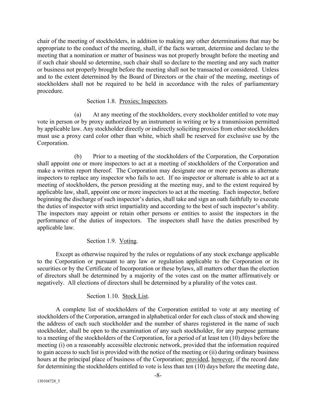 -8- 130104728_5 chair of the meeting of stockholders, in addition to making any other determinations that may be appropriate to the conduct of the meeting, shall, if the facts warrant, determine and declare to the meeting that a nomination or matter of business was not properly brought before the meeting and if such chair should so determine, such chair shall so declare to the meeting and any such matter or business not properly brought before the meeting shall not be transacted or considered. Unless and to the extent determined by the Board of Directors or the chair of the meeting, meetings of stockholders shall not be required to be held in accordance with the rules of parliamentary procedure. Section 1.8. Proxies; Inspectors. (a) At any meeting of the stockholders, every stockholder entitled to vote may vote in person or by proxy authorized by an instrument in writing or by a transmission permitted by applicable law. Any stockholder directly or indirectly soliciting proxies from other stockholders must use a proxy card color other than white, which shall be reserved for exclusive use by the Corporation. (b) Prior to a meeting of the stockholders of the Corporation, the Corporation shall appoint one or more inspectors to act at a meeting of stockholders of the Corporation and make a written report thereof. The Corporation may designate one or more persons as alternate inspectors to replace any inspector who fails to act. If no inspector or alternate is able to act at a meeting of stockholders, the person presiding at the meeting may, and to the extent required by applicable law, shall, appoint one or more inspectors to act at the meeting. Each inspector, before beginning the discharge of such inspector’s duties, shall take and sign an oath faithfully to execute the duties of inspector with strict impartiality and according to the best of such inspector’s ability. The inspectors may appoint or retain other persons or entities to assist the inspectors in the performance of the duties of inspectors. The inspectors shall have the duties prescribed by applicable law. Section 1.9. Voting. Except as otherwise required by the rules or regulations of any stock exchange applicable to the Corporation or pursuant to any law or regulation applicable to the Corporation or its securities or by the Certificate of Incorporation or these bylaws, all matters other than the election of directors shall be determined by a majority of the votes cast on the matter affirmatively or negatively. All elections of directors shall be determined by a plurality of the votes cast. Section 1.10. Stock List. A complete list of stockholders of the Corporation entitled to vote at any meeting of stockholders of the Corporation, arranged in alphabetical order for each class of stock and showing the address of each such stockholder and the number of shares registered in the name of such stockholder, shall be open to the examination of any such stockholder, for any purpose germane to a meeting of the stockholders of the Corporation, for a period of at least ten (10) days before the meeting (i) on a reasonably accessible electronic network, provided that the information required to gain access to such list is provided with the notice of the meeting or (ii) during ordinary business hours at the principal place of business of the Corporation; provided, however, if the record date for determining the stockholders entitled to vote is less than ten (10) days before the meeting date,
