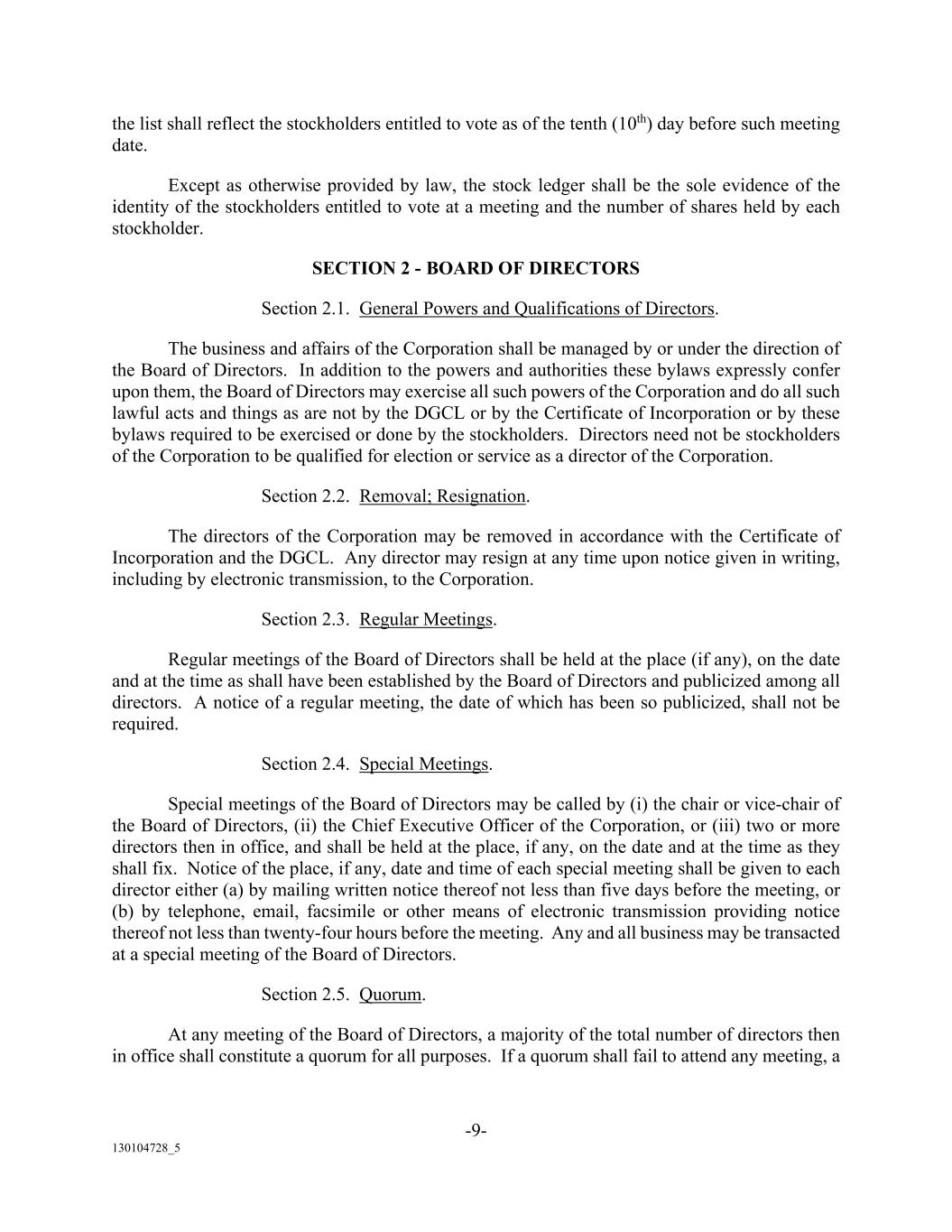 -9- 130104728_5 the list shall reflect the stockholders entitled to vote as of the tenth (10th) day before such meeting date. Except as otherwise provided by law, the stock ledger shall be the sole evidence of the identity of the stockholders entitled to vote at a meeting and the number of shares held by each stockholder. SECTION 2 - BOARD OF DIRECTORS Section 2.1. General Powers and Qualifications of Directors. The business and affairs of the Corporation shall be managed by or under the direction of the Board of Directors. In addition to the powers and authorities these bylaws expressly confer upon them, the Board of Directors may exercise all such powers of the Corporation and do all such lawful acts and things as are not by the DGCL or by the Certificate of Incorporation or by these bylaws required to be exercised or done by the stockholders. Directors need not be stockholders of the Corporation to be qualified for election or service as a director of the Corporation. Section 2.2. Removal; Resignation. The directors of the Corporation may be removed in accordance with the Certificate of Incorporation and the DGCL. Any director may resign at any time upon notice given in writing, including by electronic transmission, to the Corporation. Section 2.3. Regular Meetings. Regular meetings of the Board of Directors shall be held at the place (if any), on the date and at the time as shall have been established by the Board of Directors and publicized among all directors. A notice of a regular meeting, the date of which has been so publicized, shall not be required. Section 2.4. Special Meetings. Special meetings of the Board of Directors may be called by (i) the chair or vice-chair of the Board of Directors, (ii) the Chief Executive Officer of the Corporation, or (iii) two or more directors then in office, and shall be held at the place, if any, on the date and at the time as they shall fix. Notice of the place, if any, date and time of each special meeting shall be given to each director either (a) by mailing written notice thereof not less than five days before the meeting, or (b) by telephone, email, facsimile or other means of electronic transmission providing notice thereof not less than twenty-four hours before the meeting. Any and all business may be transacted at a special meeting of the Board of Directors. Section 2.5. Quorum. At any meeting of the Board of Directors, a majority of the total number of directors then in office shall constitute a quorum for all purposes. If a quorum shall fail to attend any meeting, a