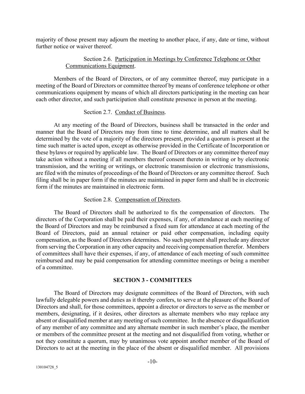 -10- 130104728_5 majority of those present may adjourn the meeting to another place, if any, date or time, without further notice or waiver thereof. Section 2.6. Participation in Meetings by Conference Telephone or Other Communications Equipment. Members of the Board of Directors, or of any committee thereof, may participate in a meeting of the Board of Directors or committee thereof by means of conference telephone or other communications equipment by means of which all directors participating in the meeting can hear each other director, and such participation shall constitute presence in person at the meeting. Section 2.7. Conduct of Business. At any meeting of the Board of Directors, business shall be transacted in the order and manner that the Board of Directors may from time to time determine, and all matters shall be determined by the vote of a majority of the directors present, provided a quorum is present at the time such matter is acted upon, except as otherwise provided in the Certificate of Incorporation or these bylaws or required by applicable law. The Board of Directors or any committee thereof may take action without a meeting if all members thereof consent thereto in writing or by electronic transmission, and the writing or writings, or electronic transmission or electronic transmissions, are filed with the minutes of proceedings of the Board of Directors or any committee thereof. Such filing shall be in paper form if the minutes are maintained in paper form and shall be in electronic form if the minutes are maintained in electronic form. Section 2.8. Compensation of Directors. The Board of Directors shall be authorized to fix the compensation of directors. The directors of the Corporation shall be paid their expenses, if any, of attendance at each meeting of the Board of Directors and may be reimbursed a fixed sum for attendance at each meeting of the Board of Directors, paid an annual retainer or paid other compensation, including equity compensation, as the Board of Directors determines. No such payment shall preclude any director from serving the Corporation in any other capacity and receiving compensation therefor. Members of committees shall have their expenses, if any, of attendance of each meeting of such committee reimbursed and may be paid compensation for attending committee meetings or being a member of a committee. SECTION 3 - COMMITTEES The Board of Directors may designate committees of the Board of Directors, with such lawfully delegable powers and duties as it thereby confers, to serve at the pleasure of the Board of Directors and shall, for those committees, appoint a director or directors to serve as the member or members, designating, if it desires, other directors as alternate members who may replace any absent or disqualified member at any meeting of such committee. In the absence or disqualification of any member of any committee and any alternate member in such member’s place, the member or members of the committee present at the meeting and not disqualified from voting, whether or not they constitute a quorum, may by unanimous vote appoint another member of the Board of Directors to act at the meeting in the place of the absent or disqualified member. All provisions