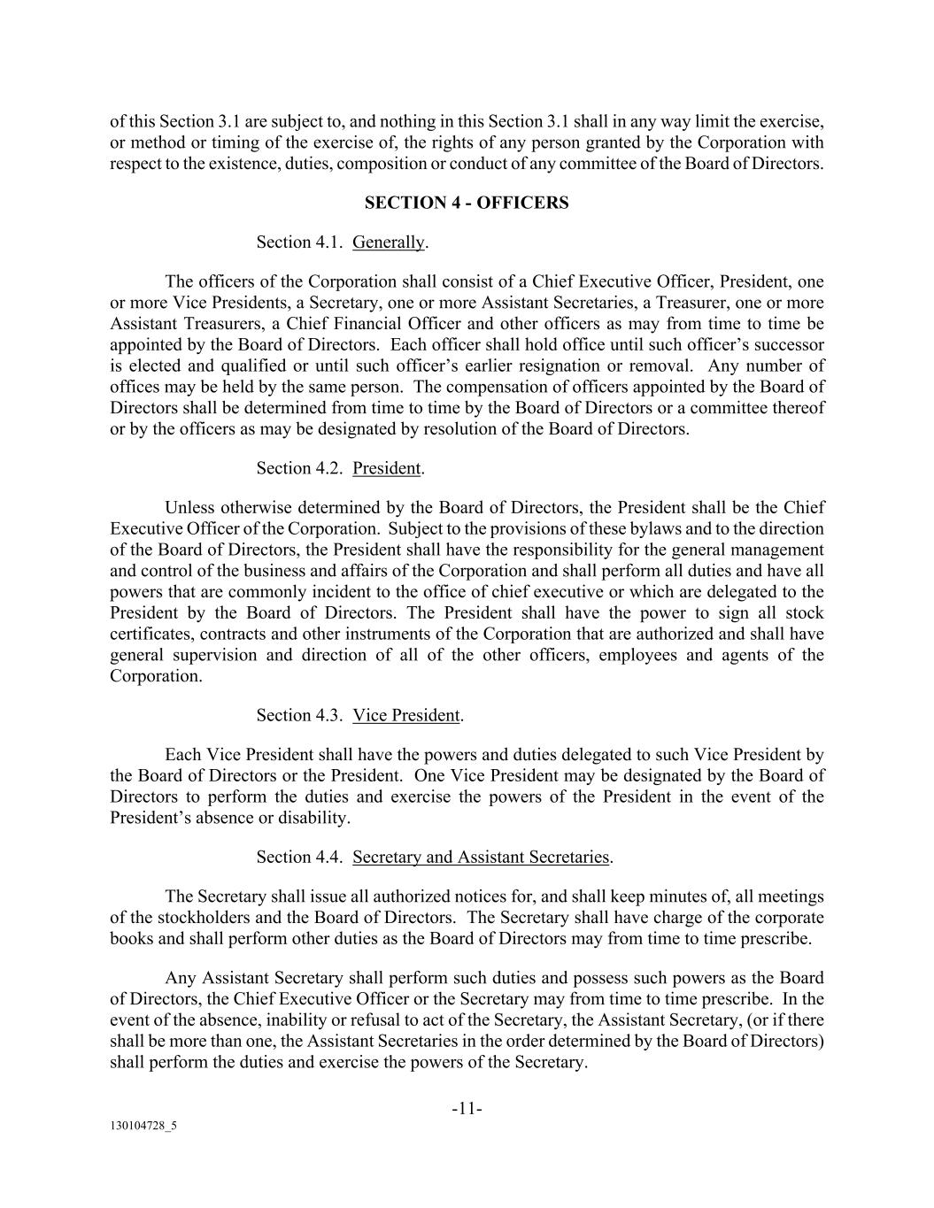 -11- 130104728_5 of this Section 3.1 are subject to, and nothing in this Section 3.1 shall in any way limit the exercise, or method or timing of the exercise of, the rights of any person granted by the Corporation with respect to the existence, duties, composition or conduct of any committee of the Board of Directors. SECTION 4 - OFFICERS Section 4.1. Generally. The officers of the Corporation shall consist of a Chief Executive Officer, President, one or more Vice Presidents, a Secretary, one or more Assistant Secretaries, a Treasurer, one or more Assistant Treasurers, a Chief Financial Officer and other officers as may from time to time be appointed by the Board of Directors. Each officer shall hold office until such officer’s successor is elected and qualified or until such officer’s earlier resignation or removal. Any number of offices may be held by the same person. The compensation of officers appointed by the Board of Directors shall be determined from time to time by the Board of Directors or a committee thereof or by the officers as may be designated by resolution of the Board of Directors. Section 4.2. President. Unless otherwise determined by the Board of Directors, the President shall be the Chief Executive Officer of the Corporation. Subject to the provisions of these bylaws and to the direction of the Board of Directors, the President shall have the responsibility for the general management and control of the business and affairs of the Corporation and shall perform all duties and have all powers that are commonly incident to the office of chief executive or which are delegated to the President by the Board of Directors. The President shall have the power to sign all stock certificates, contracts and other instruments of the Corporation that are authorized and shall have general supervision and direction of all of the other officers, employees and agents of the Corporation. Section 4.3. Vice President. Each Vice President shall have the powers and duties delegated to such Vice President by the Board of Directors or the President. One Vice President may be designated by the Board of Directors to perform the duties and exercise the powers of the President in the event of the President’s absence or disability. Section 4.4. Secretary and Assistant Secretaries. The Secretary shall issue all authorized notices for, and shall keep minutes of, all meetings of the stockholders and the Board of Directors. The Secretary shall have charge of the corporate books and shall perform other duties as the Board of Directors may from time to time prescribe. Any Assistant Secretary shall perform such duties and possess such powers as the Board of Directors, the Chief Executive Officer or the Secretary may from time to time prescribe. In the event of the absence, inability or refusal to act of the Secretary, the Assistant Secretary, (or if there shall be more than one, the Assistant Secretaries in the order determined by the Board of Directors) shall perform the duties and exercise the powers of the Secretary.