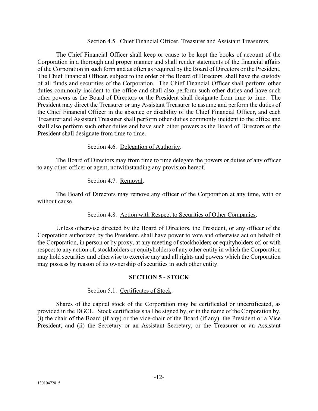 -12- 130104728_5 Section 4.5. Chief Financial Officer, Treasurer and Assistant Treasurers. The Chief Financial Officer shall keep or cause to be kept the books of account of the Corporation in a thorough and proper manner and shall render statements of the financial affairs of the Corporation in such form and as often as required by the Board of Directors or the President. The Chief Financial Officer, subject to the order of the Board of Directors, shall have the custody of all funds and securities of the Corporation. The Chief Financial Officer shall perform other duties commonly incident to the office and shall also perform such other duties and have such other powers as the Board of Directors or the President shall designate from time to time. The President may direct the Treasurer or any Assistant Treasurer to assume and perform the duties of the Chief Financial Officer in the absence or disability of the Chief Financial Officer, and each Treasurer and Assistant Treasurer shall perform other duties commonly incident to the office and shall also perform such other duties and have such other powers as the Board of Directors or the President shall designate from time to time. Section 4.6. Delegation of Authority. The Board of Directors may from time to time delegate the powers or duties of any officer to any other officer or agent, notwithstanding any provision hereof. Section 4.7. Removal. The Board of Directors may remove any officer of the Corporation at any time, with or without cause. Section 4.8. Action with Respect to Securities of Other Companies. Unless otherwise directed by the Board of Directors, the President, or any officer of the Corporation authorized by the President, shall have power to vote and otherwise act on behalf of the Corporation, in person or by proxy, at any meeting of stockholders or equityholders of, or with respect to any action of, stockholders or equityholders of any other entity in which the Corporation may hold securities and otherwise to exercise any and all rights and powers which the Corporation may possess by reason of its ownership of securities in such other entity. SECTION 5 - STOCK Section 5.1. Certificates of Stock. Shares of the capital stock of the Corporation may be certificated or uncertificated, as provided in the DGCL. Stock certificates shall be signed by, or in the name of the Corporation by, (i) the chair of the Board (if any) or the vice-chair of the Board (if any), the President or a Vice President, and (ii) the Secretary or an Assistant Secretary, or the Treasurer or an Assistant