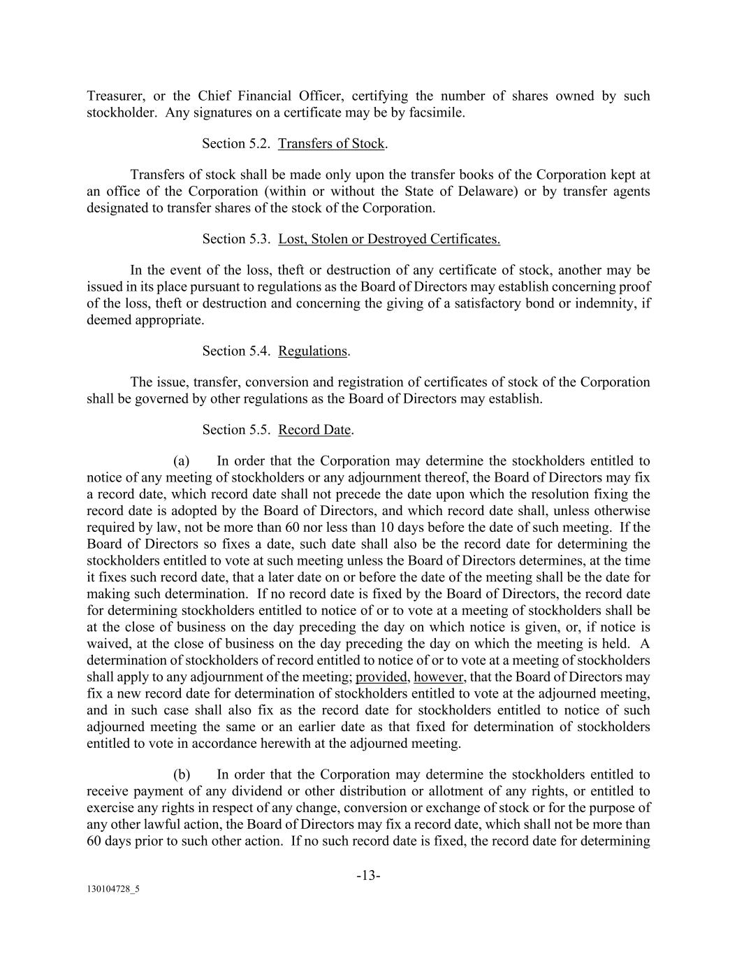 -13- 130104728_5 Treasurer, or the Chief Financial Officer, certifying the number of shares owned by such stockholder. Any signatures on a certificate may be by facsimile. Section 5.2. Transfers of Stock. Transfers of stock shall be made only upon the transfer books of the Corporation kept at an office of the Corporation (within or without the State of Delaware) or by transfer agents designated to transfer shares of the stock of the Corporation. Section 5.3. Lost, Stolen or Destroyed Certificates. In the event of the loss, theft or destruction of any certificate of stock, another may be issued in its place pursuant to regulations as the Board of Directors may establish concerning proof of the loss, theft or destruction and concerning the giving of a satisfactory bond or indemnity, if deemed appropriate. Section 5.4. Regulations. The issue, transfer, conversion and registration of certificates of stock of the Corporation shall be governed by other regulations as the Board of Directors may establish. Section 5.5. Record Date. (a) In order that the Corporation may determine the stockholders entitled to notice of any meeting of stockholders or any adjournment thereof, the Board of Directors may fix a record date, which record date shall not precede the date upon which the resolution fixing the record date is adopted by the Board of Directors, and which record date shall, unless otherwise required by law, not be more than 60 nor less than 10 days before the date of such meeting. If the Board of Directors so fixes a date, such date shall also be the record date for determining the stockholders entitled to vote at such meeting unless the Board of Directors determines, at the time it fixes such record date, that a later date on or before the date of the meeting shall be the date for making such determination. If no record date is fixed by the Board of Directors, the record date for determining stockholders entitled to notice of or to vote at a meeting of stockholders shall be at the close of business on the day preceding the day on which notice is given, or, if notice is waived, at the close of business on the day preceding the day on which the meeting is held. A determination of stockholders of record entitled to notice of or to vote at a meeting of stockholders shall apply to any adjournment of the meeting; provided, however, that the Board of Directors may fix a new record date for determination of stockholders entitled to vote at the adjourned meeting, and in such case shall also fix as the record date for stockholders entitled to notice of such adjourned meeting the same or an earlier date as that fixed for determination of stockholders entitled to vote in accordance herewith at the adjourned meeting. (b) In order that the Corporation may determine the stockholders entitled to receive payment of any dividend or other distribution or allotment of any rights, or entitled to exercise any rights in respect of any change, conversion or exchange of stock or for the purpose of any other lawful action, the Board of Directors may fix a record date, which shall not be more than 60 days prior to such other action. If no such record date is fixed, the record date for determining