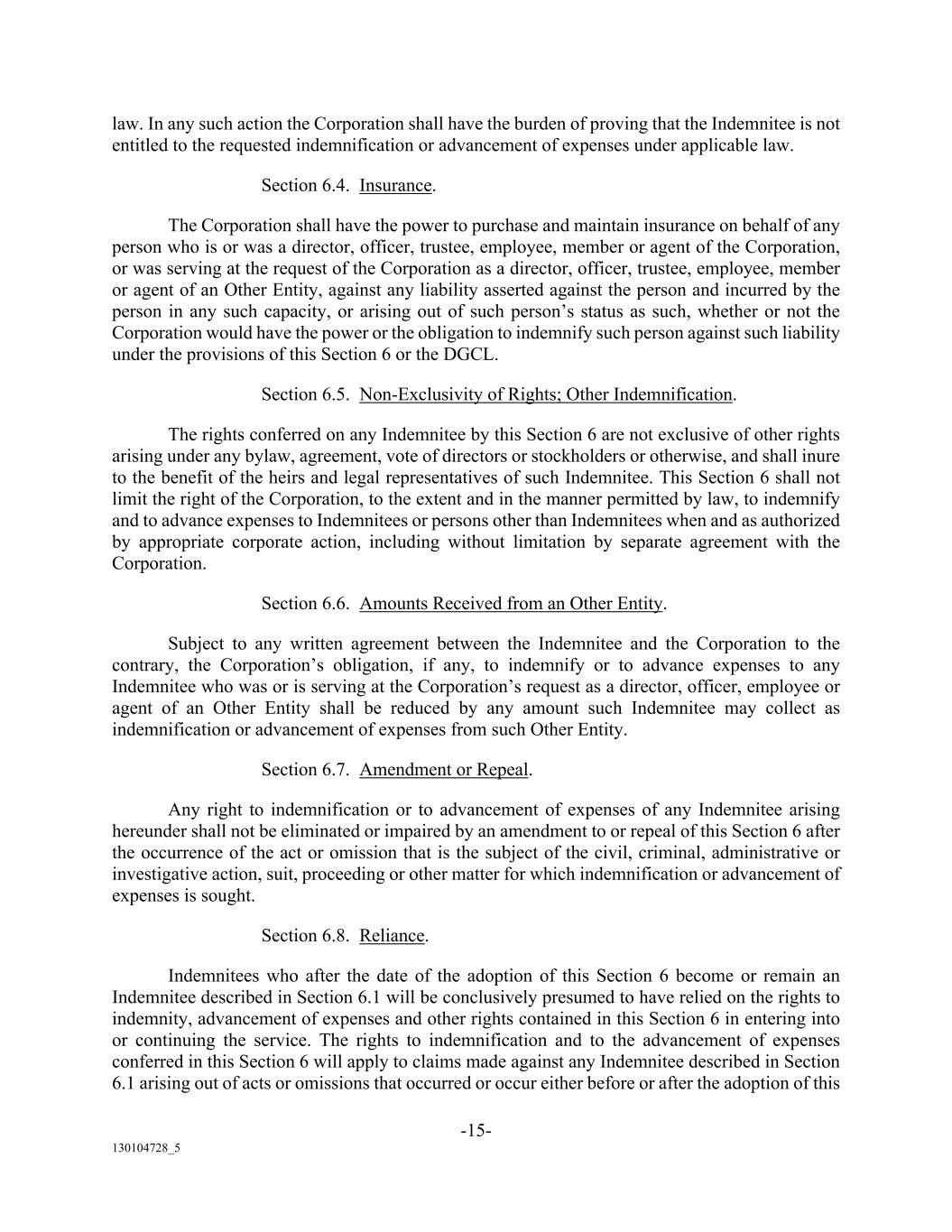 -15- 130104728_5 law. In any such action the Corporation shall have the burden of proving that the Indemnitee is not entitled to the requested indemnification or advancement of expenses under applicable law. Section 6.4. Insurance. The Corporation shall have the power to purchase and maintain insurance on behalf of any person who is or was a director, officer, trustee, employee, member or agent of the Corporation, or was serving at the request of the Corporation as a director, officer, trustee, employee, member or agent of an Other Entity, against any liability asserted against the person and incurred by the person in any such capacity, or arising out of such person’s status as such, whether or not the Corporation would have the power or the obligation to indemnify such person against such liability under the provisions of this Section 6 or the DGCL. Section 6.5. Non-Exclusivity of Rights; Other Indemnification. The rights conferred on any Indemnitee by this Section 6 are not exclusive of other rights arising under any bylaw, agreement, vote of directors or stockholders or otherwise, and shall inure to the benefit of the heirs and legal representatives of such Indemnitee. This Section 6 shall not limit the right of the Corporation, to the extent and in the manner permitted by law, to indemnify and to advance expenses to Indemnitees or persons other than Indemnitees when and as authorized by appropriate corporate action, including without limitation by separate agreement with the Corporation. Section 6.6. Amounts Received from an Other Entity. Subject to any written agreement between the Indemnitee and the Corporation to the contrary, the Corporation’s obligation, if any, to indemnify or to advance expenses to any Indemnitee who was or is serving at the Corporation’s request as a director, officer, employee or agent of an Other Entity shall be reduced by any amount such Indemnitee may collect as indemnification or advancement of expenses from such Other Entity. Section 6.7. Amendment or Repeal. Any right to indemnification or to advancement of expenses of any Indemnitee arising hereunder shall not be eliminated or impaired by an amendment to or repeal of this Section 6 after the occurrence of the act or omission that is the subject of the civil, criminal, administrative or investigative action, suit, proceeding or other matter for which indemnification or advancement of expenses is sought. Section 6.8. Reliance. Indemnitees who after the date of the adoption of this Section 6 become or remain an Indemnitee described in Section 6.1 will be conclusively presumed to have relied on the rights to indemnity, advancement of expenses and other rights contained in this Section 6 in entering into or continuing the service. The rights to indemnification and to the advancement of expenses conferred in this Section 6 will apply to claims made against any Indemnitee described in Section 6.1 arising out of acts or omissions that occurred or occur either before or after the adoption of this