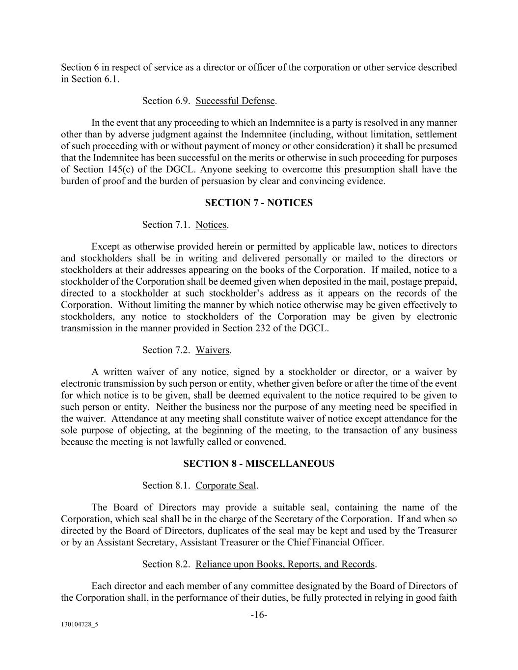 -16- 130104728_5 Section 6 in respect of service as a director or officer of the corporation or other service described in Section 6.1. Section 6.9. Successful Defense. In the event that any proceeding to which an Indemnitee is a party is resolved in any manner other than by adverse judgment against the Indemnitee (including, without limitation, settlement of such proceeding with or without payment of money or other consideration) it shall be presumed that the Indemnitee has been successful on the merits or otherwise in such proceeding for purposes of Section 145(c) of the DGCL. Anyone seeking to overcome this presumption shall have the burden of proof and the burden of persuasion by clear and convincing evidence. SECTION 7 - NOTICES Section 7.1. Notices. Except as otherwise provided herein or permitted by applicable law, notices to directors and stockholders shall be in writing and delivered personally or mailed to the directors or stockholders at their addresses appearing on the books of the Corporation. If mailed, notice to a stockholder of the Corporation shall be deemed given when deposited in the mail, postage prepaid, directed to a stockholder at such stockholder’s address as it appears on the records of the Corporation. Without limiting the manner by which notice otherwise may be given effectively to stockholders, any notice to stockholders of the Corporation may be given by electronic transmission in the manner provided in Section 232 of the DGCL. Section 7.2. Waivers. A written waiver of any notice, signed by a stockholder or director, or a waiver by electronic transmission by such person or entity, whether given before or after the time of the event for which notice is to be given, shall be deemed equivalent to the notice required to be given to such person or entity. Neither the business nor the purpose of any meeting need be specified in the waiver. Attendance at any meeting shall constitute waiver of notice except attendance for the sole purpose of objecting, at the beginning of the meeting, to the transaction of any business because the meeting is not lawfully called or convened. SECTION 8 - MISCELLANEOUS Section 8.1. Corporate Seal. The Board of Directors may provide a suitable seal, containing the name of the Corporation, which seal shall be in the charge of the Secretary of the Corporation. If and when so directed by the Board of Directors, duplicates of the seal may be kept and used by the Treasurer or by an Assistant Secretary, Assistant Treasurer or the Chief Financial Officer. Section 8.2. Reliance upon Books, Reports, and Records. Each director and each member of any committee designated by the Board of Directors of the Corporation shall, in the performance of their duties, be fully protected in relying in good faith