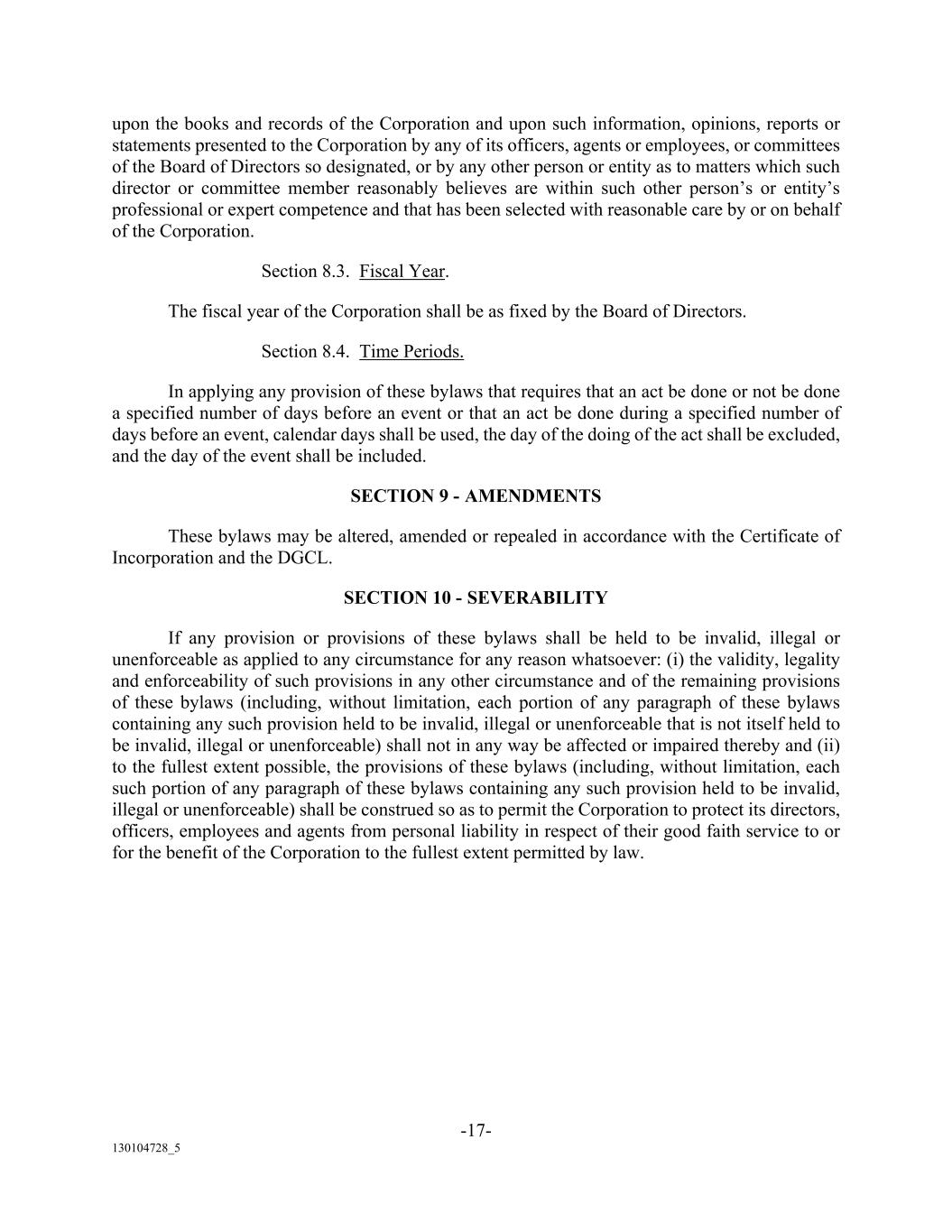 -17- 130104728_5 upon the books and records of the Corporation and upon such information, opinions, reports or statements presented to the Corporation by any of its officers, agents or employees, or committees of the Board of Directors so designated, or by any other person or entity as to matters which such director or committee member reasonably believes are within such other person’s or entity’s professional or expert competence and that has been selected with reasonable care by or on behalf of the Corporation. Section 8.3. Fiscal Year. The fiscal year of the Corporation shall be as fixed by the Board of Directors. Section 8.4. Time Periods. In applying any provision of these bylaws that requires that an act be done or not be done a specified number of days before an event or that an act be done during a specified number of days before an event, calendar days shall be used, the day of the doing of the act shall be excluded, and the day of the event shall be included. SECTION 9 - AMENDMENTS These bylaws may be altered, amended or repealed in accordance with the Certificate of Incorporation and the DGCL. SECTION 10 - SEVERABILITY If any provision or provisions of these bylaws shall be held to be invalid, illegal or unenforceable as applied to any circumstance for any reason whatsoever: (i) the validity, legality and enforceability of such provisions in any other circumstance and of the remaining provisions of these bylaws (including, without limitation, each portion of any paragraph of these bylaws containing any such provision held to be invalid, illegal or unenforceable that is not itself held to be invalid, illegal or unenforceable) shall not in any way be affected or impaired thereby and (ii) to the fullest extent possible, the provisions of these bylaws (including, without limitation, each such portion of any paragraph of these bylaws containing any such provision held to be invalid, illegal or unenforceable) shall be construed so as to permit the Corporation to protect its directors, officers, employees and agents from personal liability in respect of their good faith service to or for the benefit of the Corporation to the fullest extent permitted by law.