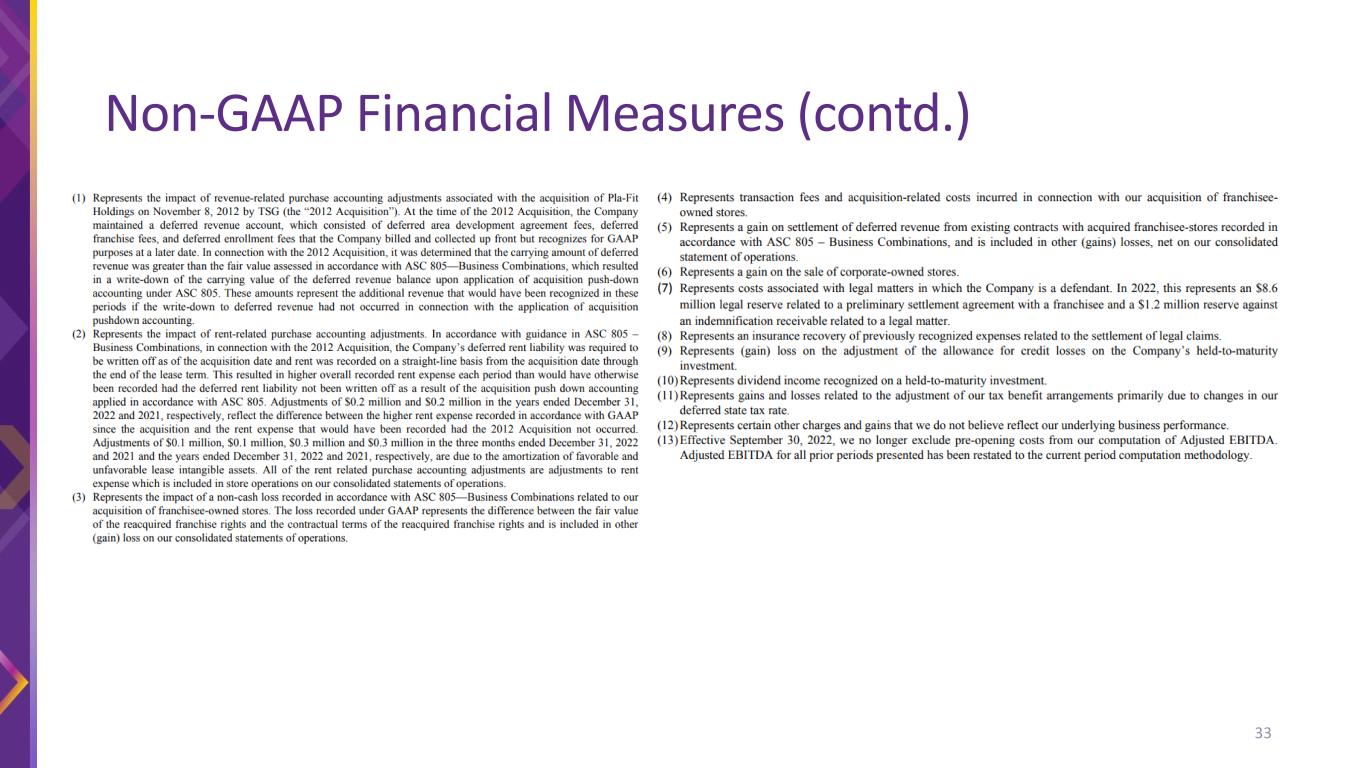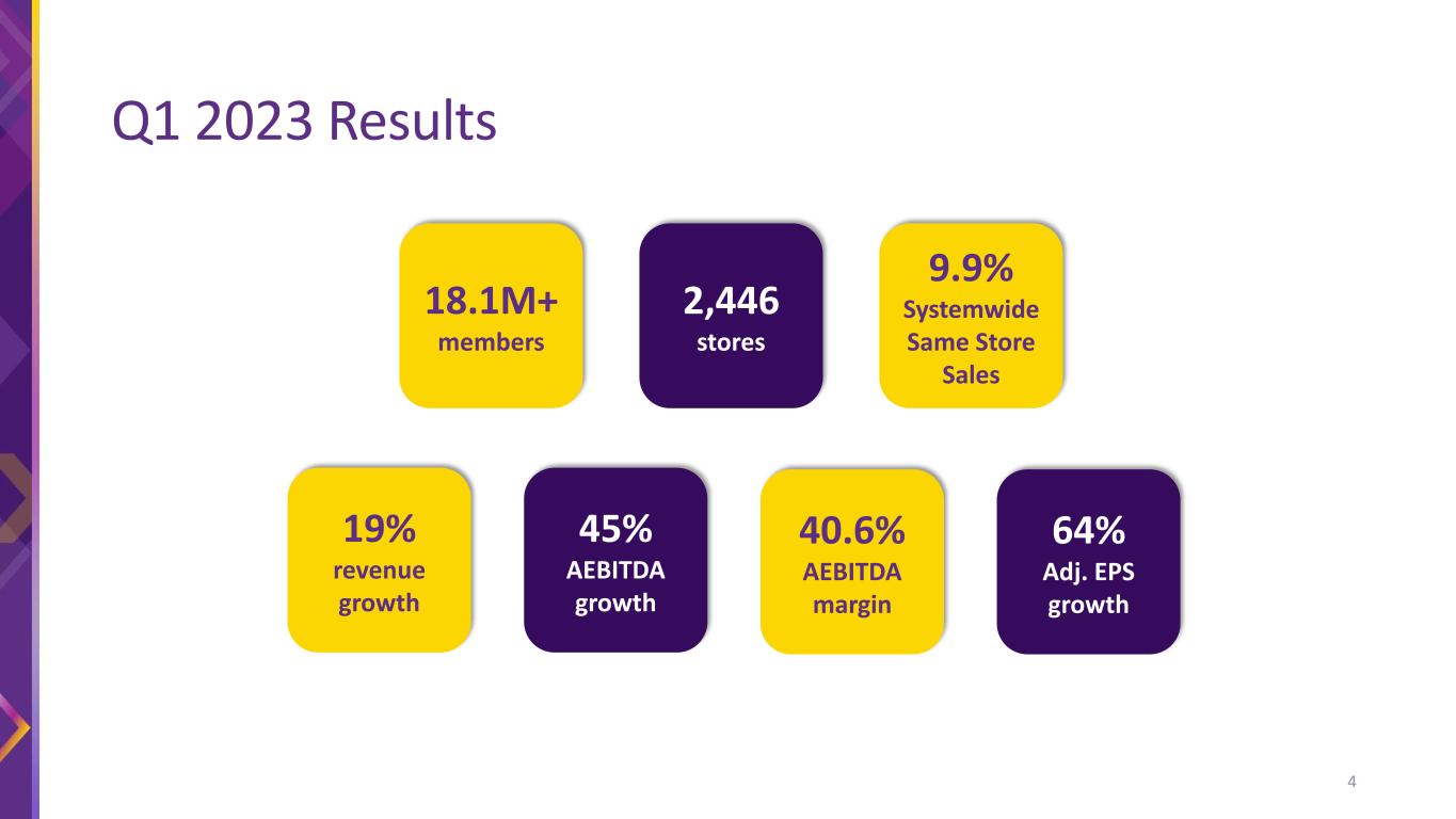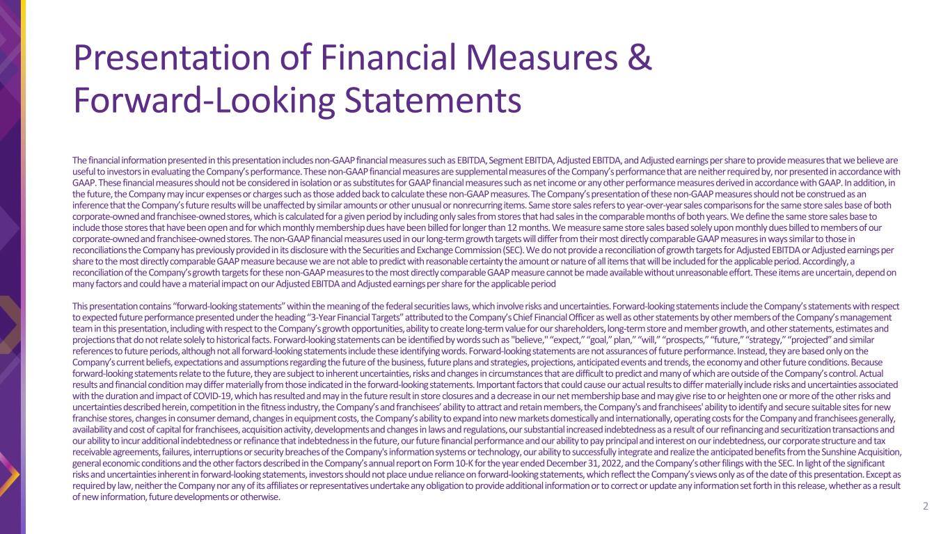 The financial information presented in this presentation includes non-GAAP financial measures such as EBITDA, Segment EBITDA, Adjusted EBITDA, and Adjusted earnings per share to provide measures that we believe are useful to investors in evaluating the Company’s performance. These non-GAAP financial measures are supplemental measures of the Company’s performance that are neither required by, nor presented in accordance with GAAP. These financial measures should not be considered in isolation or as substitutes for GAAP financial measures such as net income or any other performance measures derived in accordance with GAAP. In addition, in the future, the Company may incur expenses or charges such as those added back to calculate these non-GAAP measures. The Company’s presentation of these non-GAAP measures should not be construed as an inference that the Company’s future results will be unaffected by similar amounts or other unusual or nonrecurring items. Same store sales refers to year-over-year sales comparisons for the same store sales base of both corporate-owned and franchisee-owned stores, which is calculated for a given period by including only sales from stores that had sales in the comparable months of both years. We define the same store sales base to include those stores that have been open and for which monthly membership dues have been billed for longer than 12 months. We measure same store sales based solely upon monthly dues billed to members of our corporate-owned and franchisee-owned stores. The non-GAAP financial measures used in our long-term growth targets will differ from their most directly comparable GAAP measures in ways similar to those in reconciliations the Company has previously provided in its disclosure with the Securities and Exchange Commission (SEC). We do not provide a reconciliation of growth targets for Adjusted EBITDA or Adjusted earnings per share to the most directly comparable GAAP measure because we are not able to predict with reasonable certainty the amount or nature of all items that will be included for the applicable period. Accordingly, a reconciliation of the Company’s growth targets for these non-GAAP measures to the most directly comparable GAAP measure cannot be made available without unreasonable effort. These items are uncertain, depend on many factors and could have a material impact on our Adjusted EBITDA and Adjusted earnings per share for the applicable period This presentation contains “forward-looking statements” within the meaning of the federal securities laws, which involve risks and uncertainties. Forward-looking statements include the Company’s statements with respect to expected future performance presented under the heading “3-Year Financial Targets” attributed to the Company’s Chief Financial Officer as well as other statements by other members of the Company’s management team in this presentation, including with respect to the Company’s growth opportunities, ability to create long-term value for our shareholders, long-term store and member growth, and other statements, estimates and projections that do not relate solely to historical facts. Forward-looking statements can be identified by words such as "believe," “expect,” “goal,” plan,” “will,” “prospects,” “future,” “strategy,” “projected” and similar references to future periods, although not all forward-looking statements include these identifying words. Forward-looking statements are not assurances of future performance. Instead, they are based only on the Company’s current beliefs, expectations and assumptions regarding the future of the business, future plans and strategies, projections, anticipated events and trends, the economy and other future conditions. Because forward-looking statements relate to the future, they are subject to inherent uncertainties, risks and changes in circumstances that are difficult to predict and many of which are outside of the Company’s control. Actual results and financial condition may differ materially from those indicated in the forward-looking statements. Important factors that could cause our actual results to differ materially include risks and uncertainties associated with the duration and impact of COVID-19, which has resulted and may in the future result in store closures and a decrease in our net membership base and may give rise to or heighten one or more of the other risks and uncertainties described herein, competition in the fitness industry, the Company’s and franchisees’ ability to attract and retain members, the Company's and franchisees' ability to identify and secure suitable sites for new franchise stores, changes in consumer demand, changes in equipment costs, the Company’s ability to expand into new markets domestically and internationally, operating costs for the Company and franchisees generally, availability and cost of capital for franchisees, acquisition activity, developments and changes in laws and regulations, our substantial increased indebtedness as a result of our refinancing and securitization transactions and our ability to incur additional indebtedness or refinance that indebtedness in the future, our future financial performance and our ability to pay principal and interest on our indebtedness, our corporate structure and tax receivable agreements, failures, interruptions or security breaches of the Company's information systems or technology, our ability to successfully integrate and realize the anticipated benefits from the Sunshine Acquisition, general economic conditions and the other factors described in the Company’s annual report on Form 10-K for the year ended December 31, 2022, and the Company’s other filings with the SEC. In light of the significant risks and uncertainties inherent in forward-looking statements, investors should not place undue reliance on forward-looking statements, which reflect the Company’s views o