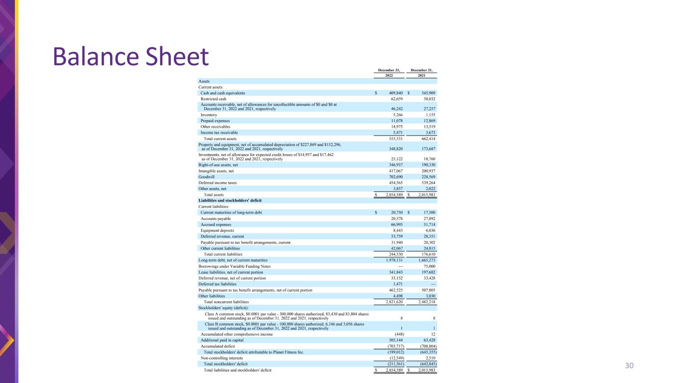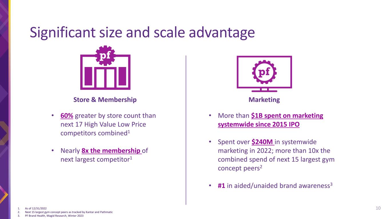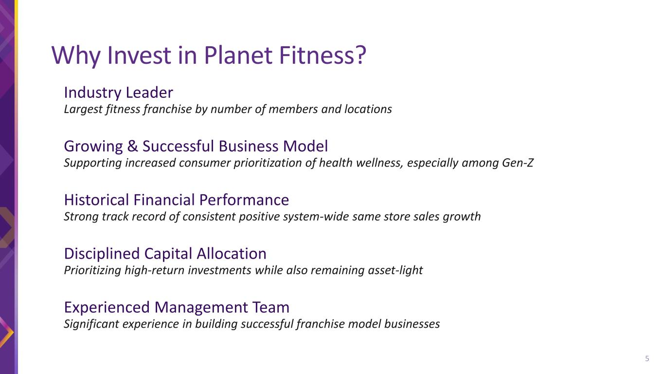 The financial information presented in this presentation includes non-GAAP financial measures such as EBITDA, Segment EBITDA, Adjusted EBITDA, and Adjusted earnings per share to provide measures that we believe are useful to investors in evaluating the Company’s performance. These non-GAAP financial measures are supplemental measures of the Company’s performance that are neither required by, nor presented in accordance with GAAP. These financial measures should not be considered in isolation or as substitutes for GAAP financial measures such as net income or any other performance measures derived in accordance with GAAP. In addition, in the future, the Company may incur expenses or charges such as those added back to calculate these non-GAAP measures. The Company’s presentation of these non-GAAP measures should not be construed as an inference that the Company’s future results will be unaffected by similar amounts or other unusual or nonrecurring items. Same store sales refers to year-over-year sales comparisons for the same store sales base of both corporate-owned and franchisee-owned stores, which is calculated for a given period by including only sales from stores that had sales in the comparable months of both years. We define the same store sales base to include those stores that have been open and for which monthly membership dues have been billed for longer than 12 months. We measure same store sales based solely upon monthly dues billed to members of our corporate-owned and franchisee-owned stores. The non-GAAP financial measures used in our long-term growth targets will differ from their most directly comparable GAAP measures in ways similar to those in reconciliations the Company has previously provided in its disclosure with the Securities and Exchange Commission (SEC). We do not provide a reconciliation of growth targets for Adjusted EBITDA or Adjusted earnings per share to the most directly comparable GAAP measure because we are not able to predict with reasonable certainty the amount or nature of all items that will be included for the applicable period. Accordingly, a reconciliation of the Company’s growth targets for these non-GAAP measures to the most directly comparable GAAP measure cannot be made available without unreasonable effort. These items are uncertain, depend on many factors and could have a material impact on our Adjusted EBITDA and Adjusted earnings per share for the applicable period This presentation contains “forward-looking statements” within the meaning of the federal securities laws, which involve risks and uncertainties. Forward-looking statements include the Company’s statements with respect to expected future performance presented under the heading “3-Year Financial Targets” attributed to the Company’s Chief Financial Officer as well as other statements by other members of the Company’s management team in this presentation, including with respect to the Company’s growth opportunities, ability to create long-term value for our shareholders, long-term store and member growth, and other statements, estimates and projections that do not relate solely to historical facts. Forward-looking statements can be identified by words such as "believe," “expect,” “goal,” plan,” “will,” “prospects,” “future,” “strategy,” “projected” and similar references to future periods, although not all forward-looking statements include these identifying words. Forward-looking statements are not assurances of future performance. Instead, they are based only on the Company’s current beliefs, expectations and assumptions regarding the future of the business, future plans and strategies, projections, anticipated events and trends, the economy and other future conditions. Because forward-looking statements relate to the future, they are subject to inherent uncertainties, risks and changes in circumstances that are difficult to predict and many of which are outside of the Company’s control. Actual results and financial condition may differ materially from those indicated in the forward-looking statements. Important factors that could cause our actual results to differ materially include risks and uncertainties associated with the duration and impact of COVID-19, which has resulted and may in the future result in store closures and a decrease in our net membership base and may give rise to or heighten one or more of the other risks and uncertainties described herein, competition in the fitness industry, the Company’s and franchisees’ ability to attract and retain members, the Company's and franchisees' ability to identify and secure suitable sites for new franchise stores, changes in consumer demand, changes in equipment costs, the Company’s ability to expand into new markets domestically and internationally, operating costs for the Company and franchisees generally, availability and cost of capital for franchisees, acquisition activity, developments and changes in laws and regulations, our substantial increased indebtedness as a result of our refinancing and securitization transactions and our ability to incur additional indebtedness or refinance that indebtedness in the future, our future financial performance and our ability to pay principal and interest on our indebtedness, our corporate structure and tax receivable agreements, failures, interruptions or security breaches of the Company's information systems or technology, our ability to successfully integrate and realize the anticipated benefits from the Sunshine Acquisition, general economic conditions and the other factors described in the Company’s annual report on Form 10-K for the year ended December 31, 2022, and the Company’s other filings with the SEC. In light of the significant risks and uncertainties inherent in forward-looking statements, investors should not place undue reliance on forward-looking statements, which reflect the Company’s views o