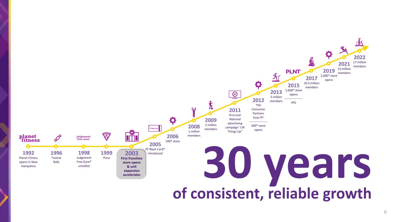 Why Invest in Planet Fitness? Industry Leader Largest fitness franchise by number of members and locations Growing & Successful Business Model Supporting increased consumer prioritization of health wellness, especially among Gen-Z Historical Financial Performance Strong track record of consistent positive system-wide same store sales growth Disciplined Capital Allocation Prioritizing high-return investments while also remaining asset-light Experienced Management Team Significant experience in building successful franchise model businesses 5
