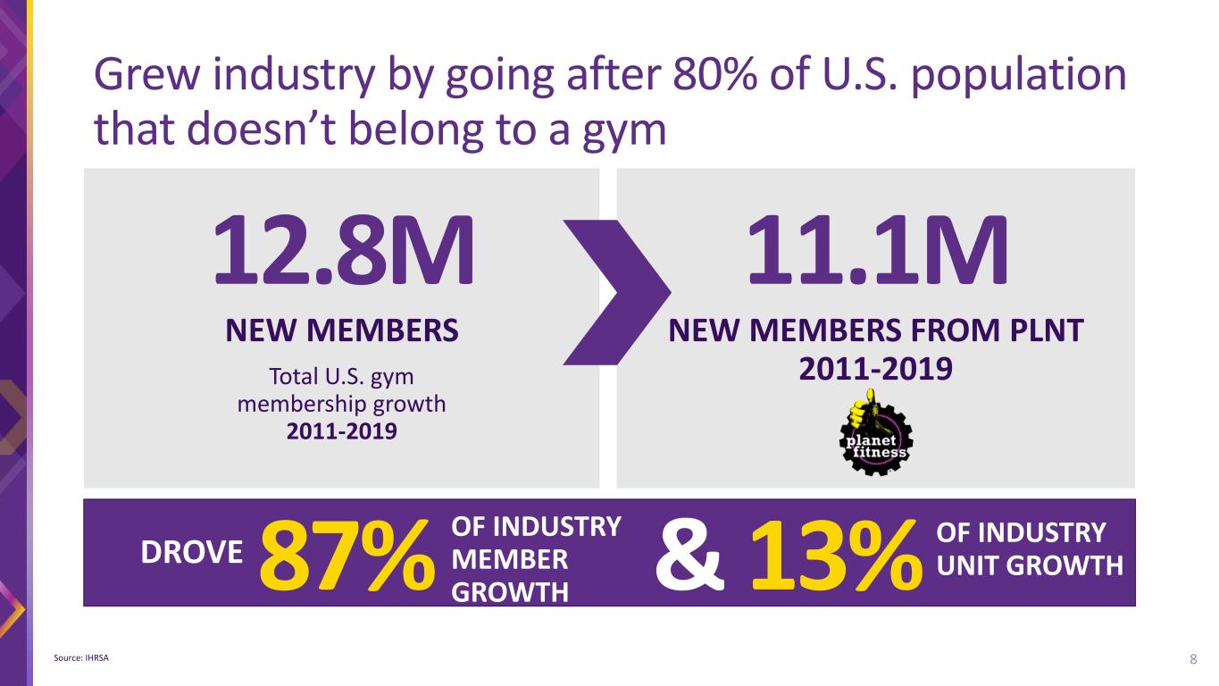 DIFFERENTIATED MODEL Disruptive Brand 80% unserved Judgement Free Great Value Streamlined Operating Model Re-equip schedules Unique royalty stream Disciplined Franchise Model 7