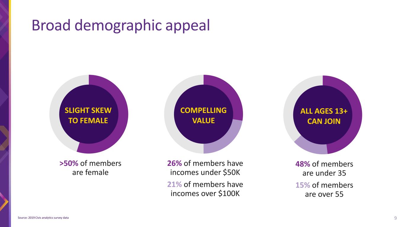 Broad demographic appeal Source: 2019 Civis analytics survey data SLIGHT SKEW TO FEMALE >50% of members are female COMPELLING VALUE 26% of members have incomes under $50K 21% of members have incomes over $100K ALL AGES 13+ CAN JOIN 48% of members are under 35 15% of members are over 55 9