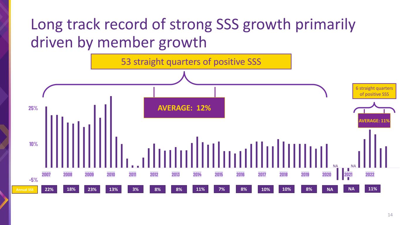 -5% 10% 25% 2007 2008 2009 2010 2011 2012 2013 2014 2015 2016 2017 2018 2019 2020 2021 2022 Long track record of strong SSS growth primarily driven by member growth 53 straight quarters of positive SSS AVERAGE: 12% 18% NANA Annual SSS 23%22% 13% 3% 8% 8% 11% 7% 8% 10% 10% 8% NA NA 11% 14 AVERAGE: 11% 6 straight quarters of positive SSS