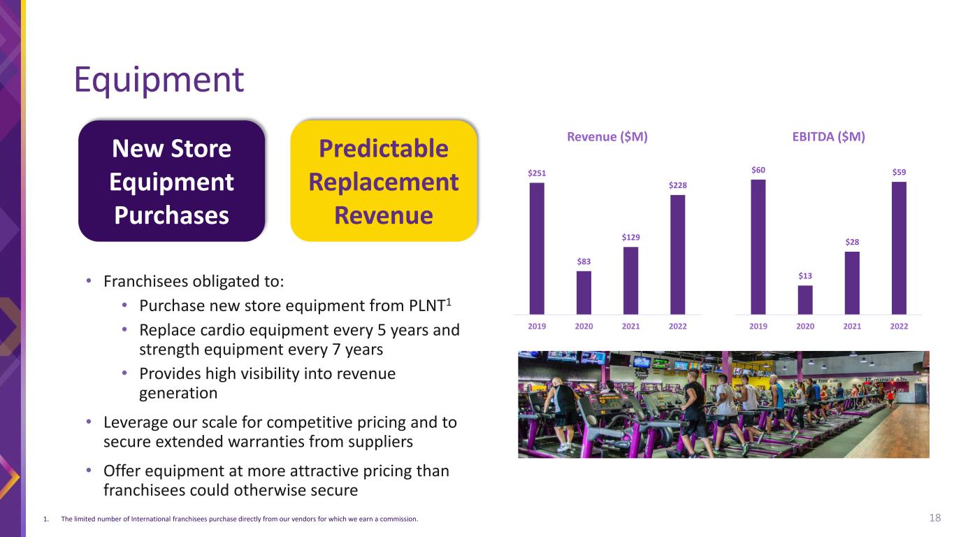 Equipment • Franchisees obligated to: • Purchase new store equipment from PLNT1 • Replace cardio equipment every 5 years and strength equipment every 7 years • Provides high visibility into revenue generation • Leverage our scale for competitive pricing and to secure extended warranties from suppliers • Offer equipment at more attractive pricing than franchisees could otherwise secure $251 $83 $129 $228 2019 2020 2021 2022 Revenue ($M) $60 $13 $28 $59 2019 2020 2021 2022 EBITDA ($M) 18 New Store Equipment Purchases Predictable Replacement Revenue 1. The limited number of International franchisees purchase directly from our vendors for which we earn a commission.