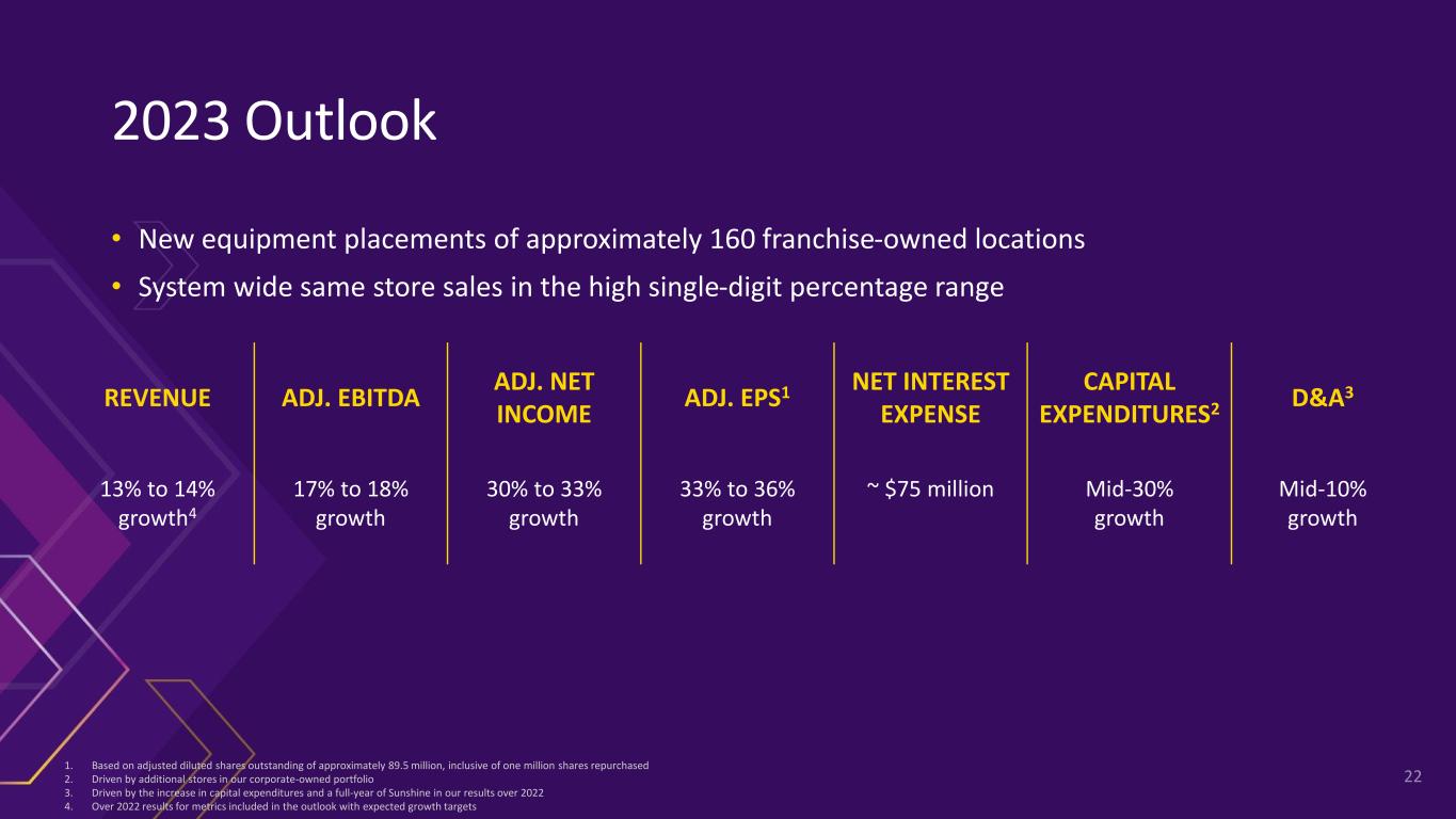 2023 Outlook • New equipment placements of approximately 160 franchise-owned locations • System wide same store sales in the high single-digit percentage range 1. Based on adjusted diluted shares outstanding of approximately 89.5 million, inclusive of one million shares repurchased 2. Driven by additional stores in our corporate-owned portfolio 3. Driven by the increase in capital expenditures and a full-year of Sunshine in our results over 2022 4. Over 2022 results for metrics included in the outlook with expected growth targets REVENUE ADJ. EBITDA ADJ. NET INCOME ADJ. EPS1 NET INTEREST EXPENSE CAPITAL EXPENDITURES2 D&A3 13% to 14% growth4 17% to 18% growth 30% to 33% growth 33% to 36% growth ~ $75 million Mid-30% growth Mid-10% growth 22