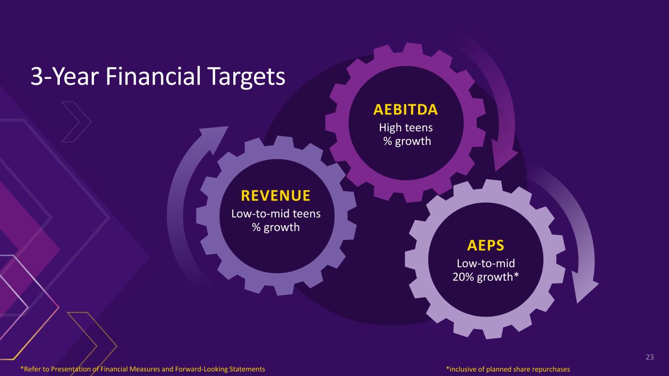 3-Year Financial Targets AEBITDA High teens % growth REVENUE Low-to-mid teens % growth AEPS Low-to-mid 20% growth* *inclusive of planned share repurchases*Refer to Presentation of Financial Measures and Forward-Looking Statements 23