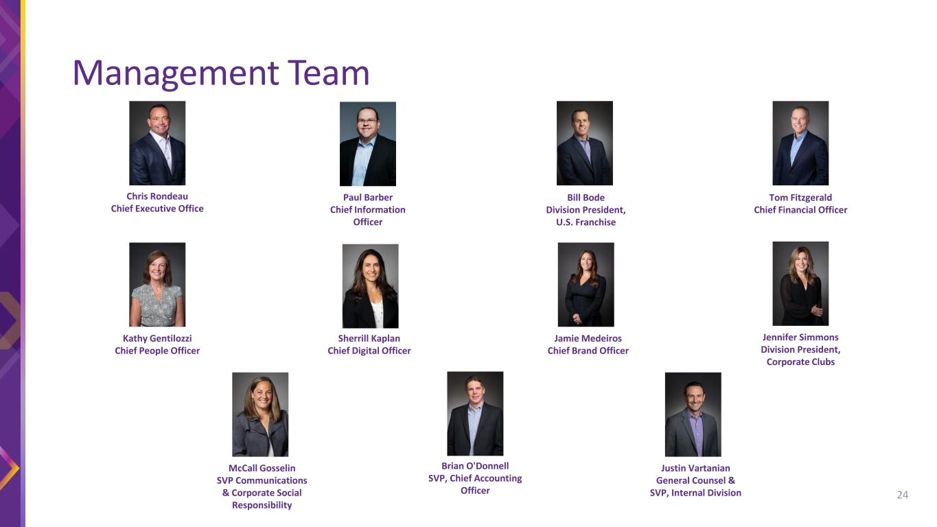 Management Team Chris Rondeau Chief Executive Office Paul Barber Chief Information Officer Bill Bode Division President, U.S. Franchise Tom Fitzgerald Chief Financial Officer Kathy Gentilozzi Chief People Officer Sherrill Kaplan Chief Digital Officer Jamie Medeiros Chief Brand Officer Jennifer Simmons Division President, Corporate Clubs McCall Gosselin SVP Communications & Corporate Social Responsibility Brian O'Donnell SVP, Chief Accounting Officer Justin Vartanian General Counsel & SVP, Internal Division 24