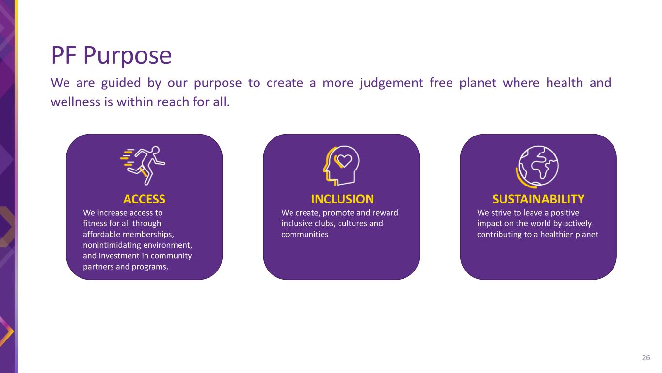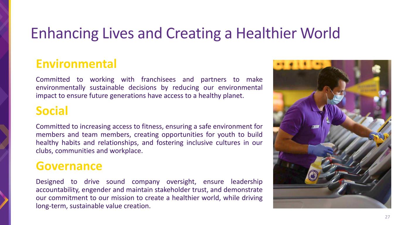 PF Purpose ACCESS We increase access to fitness for all through affordable memberships, nonintimidating environment, and investment in community partners and programs. INCLUSION We create, promote and reward inclusive clubs, cultures and communities SUSTAINABILITY We strive to leave a positive impact on the world by actively contributing to a healthier planet 26 We are guided by our purpose to create a more judgement free planet where health and wellness is within reach for all.