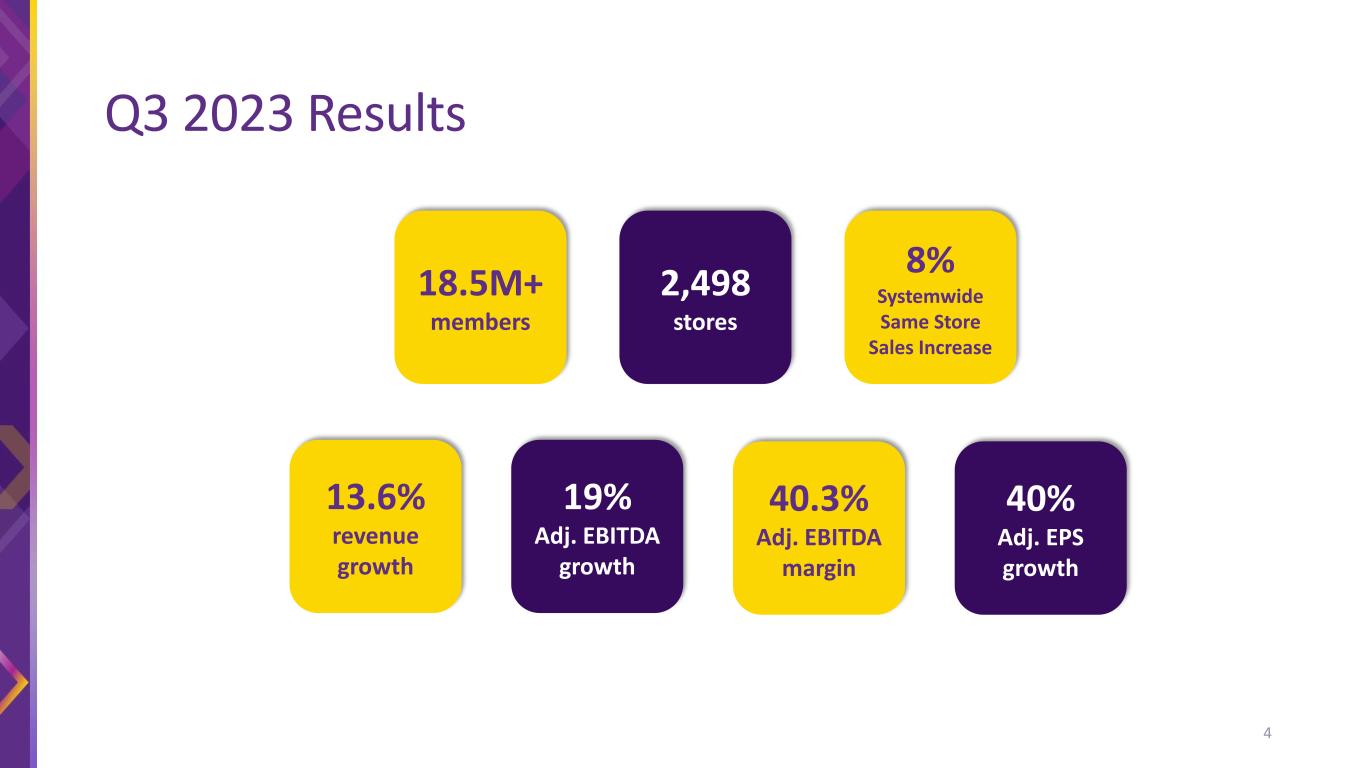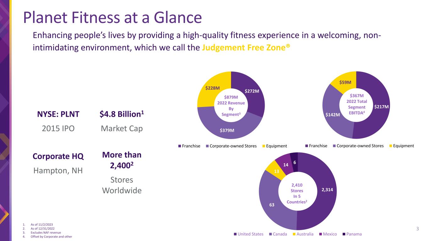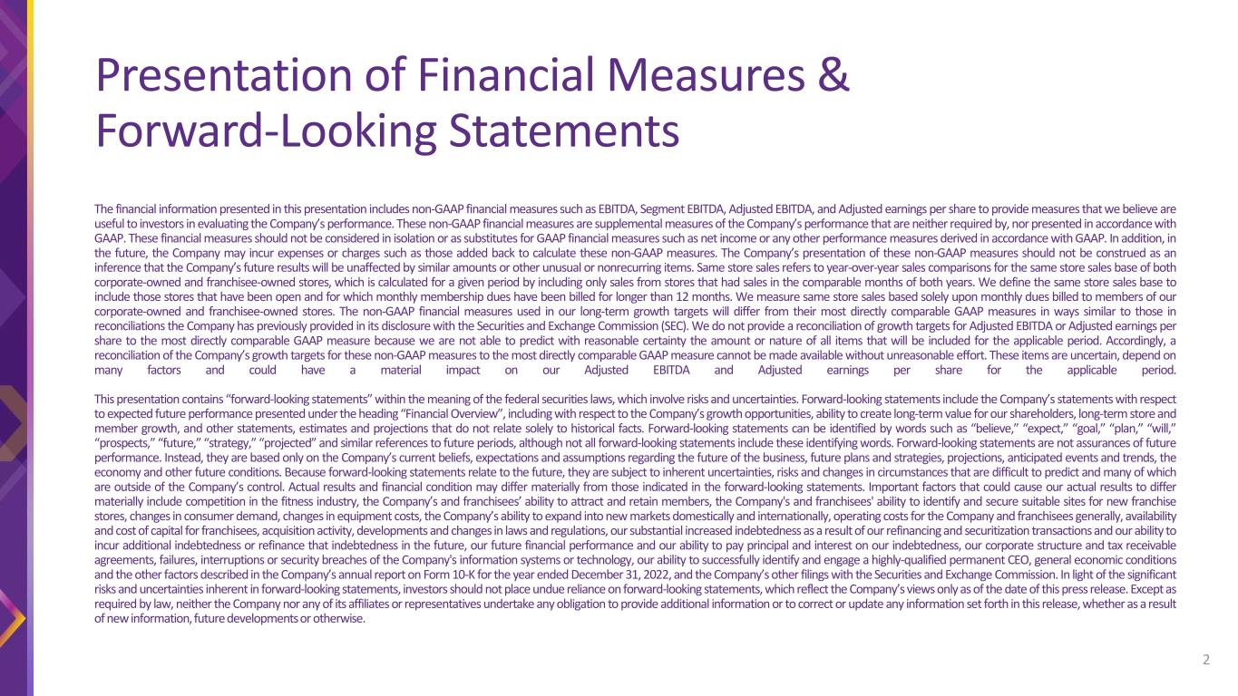 The financial information presented in this presentation includes non-GAAP financial measures such as EBITDA, Segment EBITDA, Adjusted EBITDA, and Adjusted earnings per share to provide measures that we believe are useful to investors in evaluating the Company’s performance. These non-GAAP financial measures are supplemental measures of the Company’s performance that are neither required by, nor presented in accordance with GAAP. These financial measures should not be considered in isolation or as substitutes for GAAP financial measures such as net income or any other performance measures derived in accordance with GAAP. In addition, in the future, the Company may incur expenses or charges such as those added back to calculate these non-GAAP measures. The Company’s presentation of these non-GAAP measures should not be construed as an inference that the Company’s future results will be unaffected by similar amounts or other unusual or nonrecurring items. Same store sales refers to year-over-year sales comparisons for the same store sales base of both corporate-owned and franchisee-owned stores, which is calculated for a given period by including only sales from stores that had sales in the comparable months of both years. We define the same store sales base to include those stores that have been open and for which monthly membership dues have been billed for longer than 12 months. We measure same store sales based solely upon monthly dues billed to members of our corporate-owned and franchisee-owned stores. The non-GAAP financial measures used in our long-term growth targets will differ from their most directly comparable GAAP measures in ways similar to those in reconciliations the Company has previously provided in its disclosure with the Securities and Exchange Commission (SEC). We do not provide a reconciliation of growth targets for Adjusted EBITDA or Adjusted earnings per share to the most directly comparable GAAP measure because we are not able to predict with reasonable certainty the amount or nature of all items that will be included for the applicable period. Accordingly, a reconciliation of the Company’s growth targets for these non-GAAP measures to the most directly comparable GAAP measure cannot be made available without unreasonable effort. These items are uncertain, depend on many factors and could have a material impact on our Adjusted EBITDA and Adjusted earnings per share for the applicable period. This presentation contains “forward-looking statements” within the meaning of the federal securities laws, which involve risks and uncertainties. Forward-looking statements include the Company’s statements with respect to expected future performance presented under the heading “Financial Overview”, including with respect to the Company’s growth opportunities, ability to create long-term value for our shareholders, long-term store and member growth, and other statements, estimates and projections that do not relate solely to historical facts. Forward-looking statements can be identified by words such as “believe,” “expect,” “goal,” “plan,” “will,” “prospects,” “future,” “strategy,” “projected” and similar references to future periods, although not all forward-looking statements include these identifying words. Forward-looking statements are not assurances of future performance. Instead, they are based only on the Company’s current beliefs, expectations and assumptions regarding the future of the business, future plans and strategies, projections, anticipated events and trends, the economy and other future conditions. Because forward-looking statements relate to the future, they are subject to inherent uncertainties, risks and changes in circumstances that are difficult to predict and many of which are outside of the Company’s control. Actual results and financial condition may differ materially from those indicated in the forward-looking statements. Important factors that could cause our actual results to differ materially include competition in the fitness industry, the Company’s and franchisees’ ability to attract and retain members, the Company's and franchisees' ability to identify and secure suitable sites for new franchise stores, changes in consumer demand, changes in equipment costs, the Company’s ability to expand into new markets domestically and internationally, operating costs for the Company and franchisees generally, availability and cost of capital for franchisees, acquisition activity, developments and changes in laws and regulations, our substantial increased indebtedness as a result of our refinancing and securitization transactions and our ability to incur additional indebtedness or refinance that indebtedness in the future, our future financial performance and our ability to pay principal and interest on our indebtedness, our corporate structure and tax receivable agreements, failures, interruptions or security breaches of the Company's information systems or technology, our ability to successfully identify and engage a highly-qualified permanent CEO, general economic conditions and the other factors described in the Company’s annual report on Form 10-K for the year ended December 31, 2022, and the Company’s other filings with the Securities and Exchange Commission. In light of the significant risks and uncertainties inherent in forward-looking statements, investors should not place undue reliance on forward-looking statements, which reflect the Company’s views only as of the date of this press release. Except as required by law, neither the Company nor any of its affiliates or representatives undertake any obligation to provide additional information or to correct or update any information set forth in this release, whether as a result of new information, future developments or otherwise. Presentation of Financial Measures & Forward-Looking Statements 2