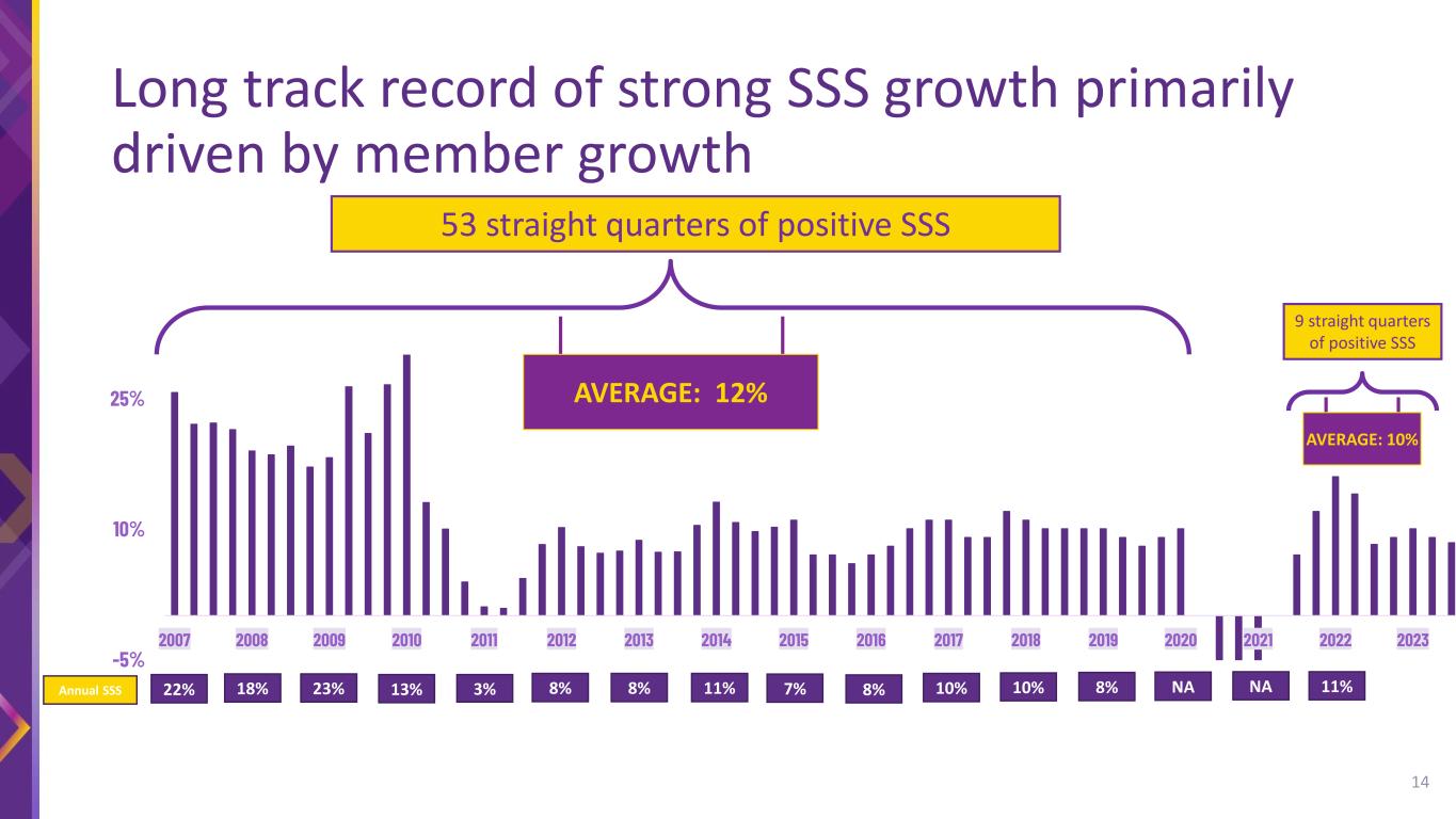 Long track record of strong SSS growth primarily driven by member growth 53 straight quarters of positive SSS AVERAGE: 12% 18%Annual SSS 23%22% 13% 3% 8% 8% 11% 7% 8% 10% 10% 8% NA NA 11% 14 AVERAGE: 10% 9 straight quarters of positive SSS -5% 10% 25% 2007 2008 2009 2010 2011 2012 2013 2014 2015 2016 2017 2018 2019 2020 2021 2022 2023