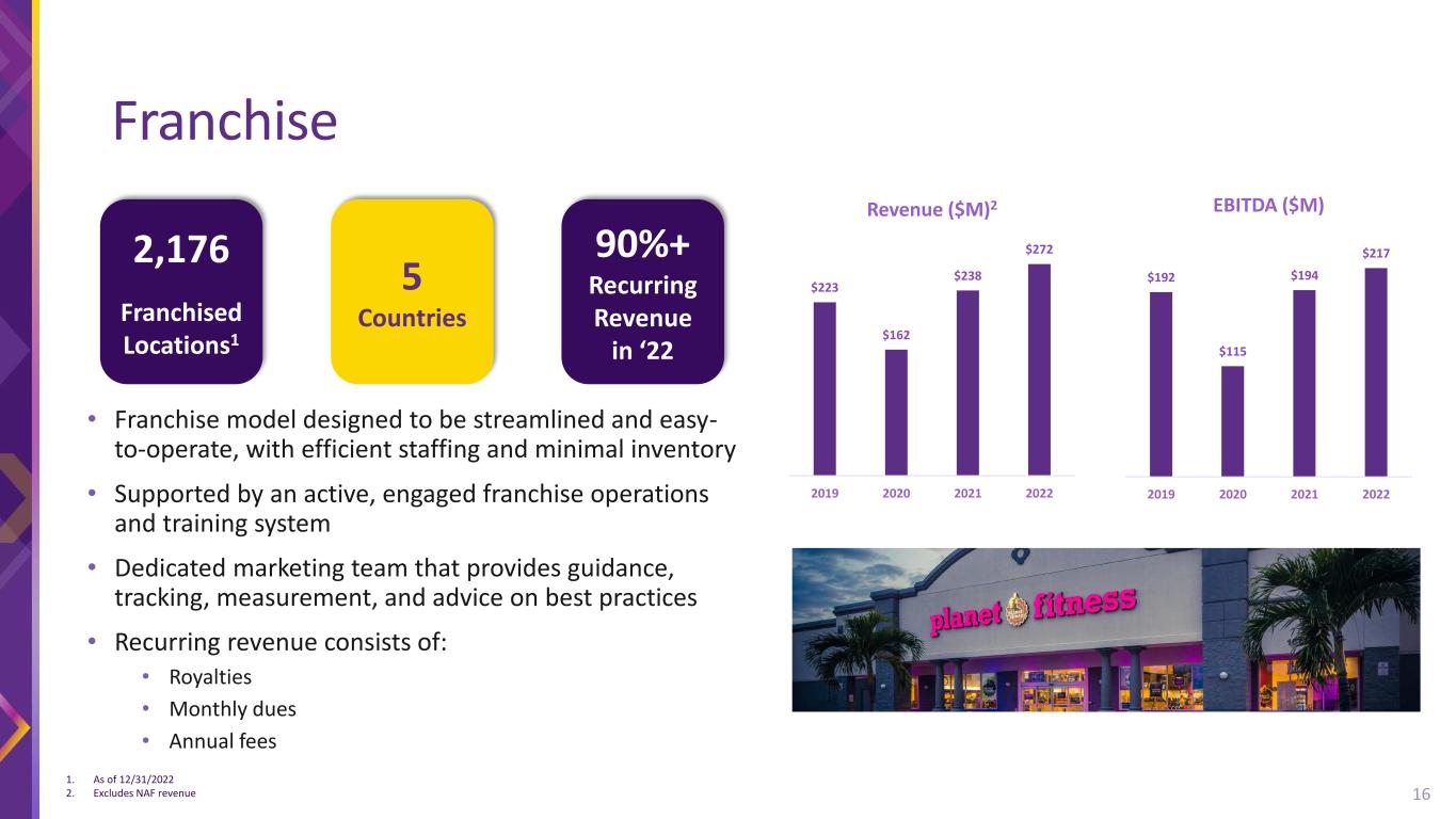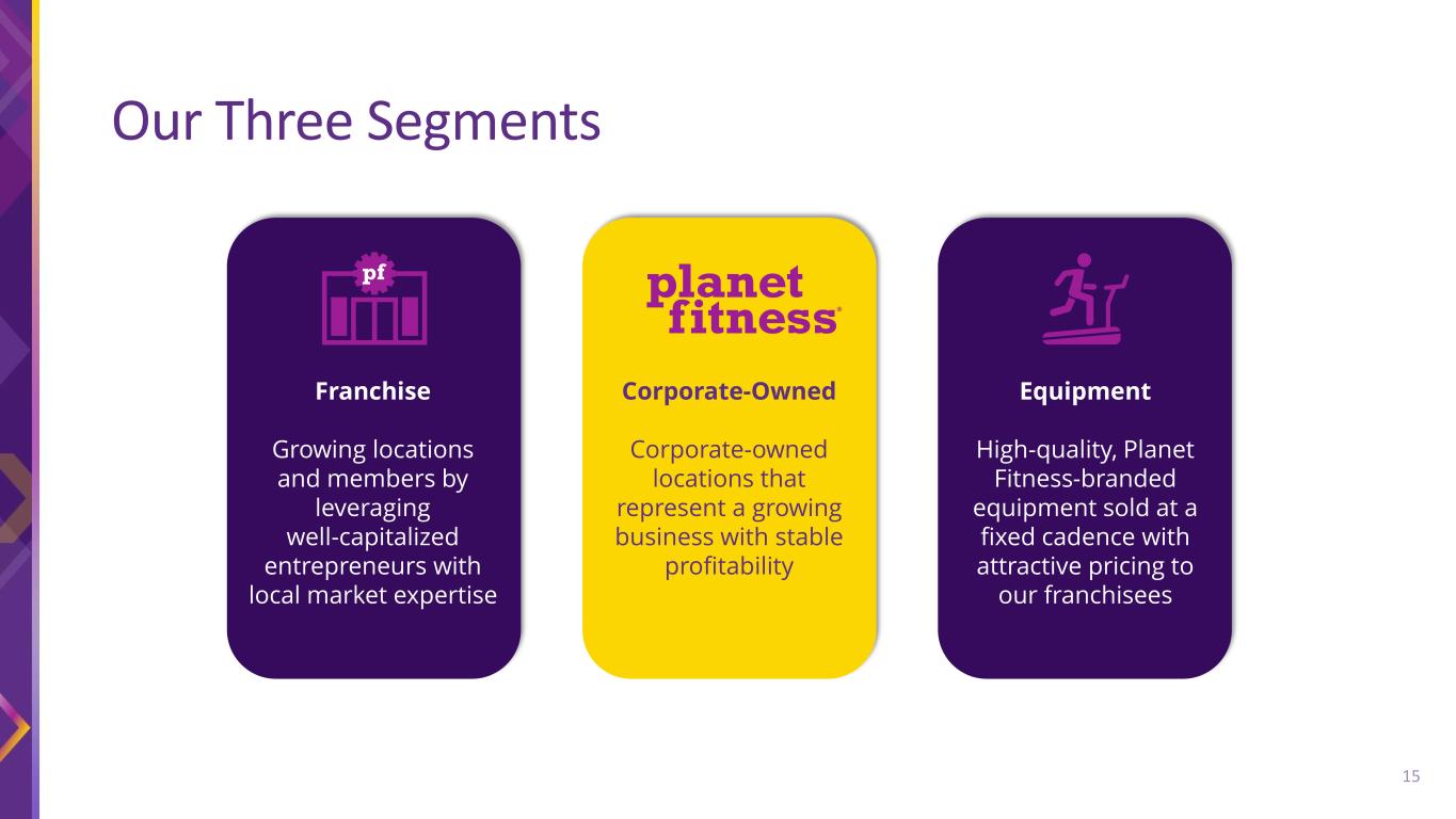 Our Three Segments Franchise Growing locations and members by leveraging well-capitalized entrepreneurs with local market expertise Corporate-Owned Corporate-owned locations that represent a growing business with stable profitability Equipment High-quality, Planet Fitness-branded equipment sold at a fixed cadence with attractive pricing to our franchisees 15
