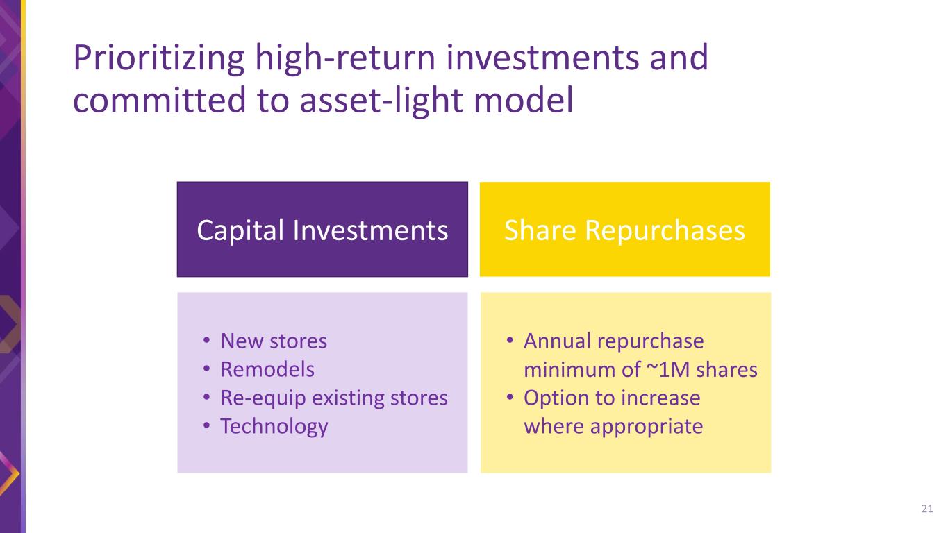 Prioritizing high-return investments and committed to asset-light model 21 Capital Investments Share Repurchases • New stores • Remodels • Re-equip existing stores • Technology • Annual repurchase minimum of ~1M shares • Option to increase where appropriate