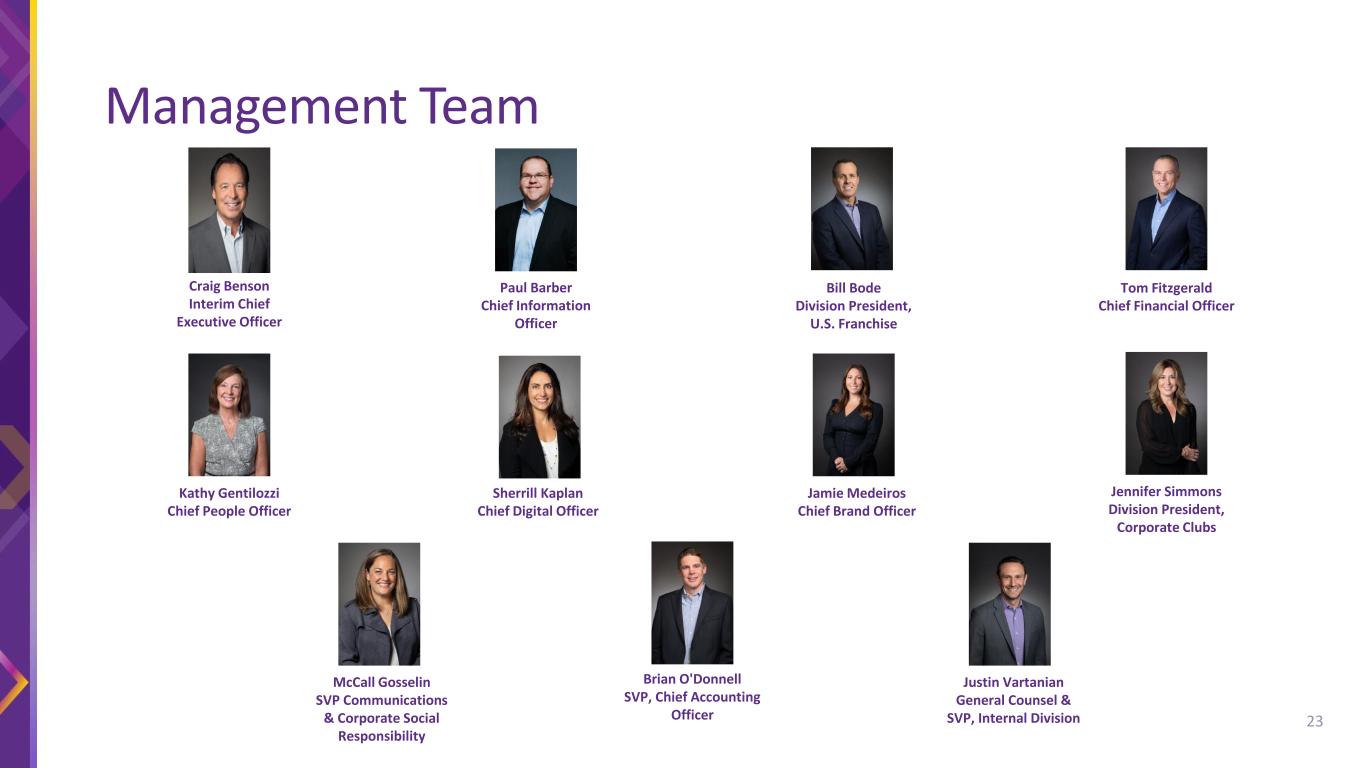 Management Team Craig Benson Interim Chief Executive Officer Paul Barber Chief Information Officer Bill Bode Division President, U.S. Franchise Tom Fitzgerald Chief Financial Officer Kathy Gentilozzi Chief People Officer Sherrill Kaplan Chief Digital Officer Jamie Medeiros Chief Brand Officer Jennifer Simmons Division President, Corporate Clubs McCall Gosselin SVP Communications & Corporate Social Responsibility Brian O'Donnell SVP, Chief Accounting Officer Justin Vartanian General Counsel & SVP, Internal Division 23