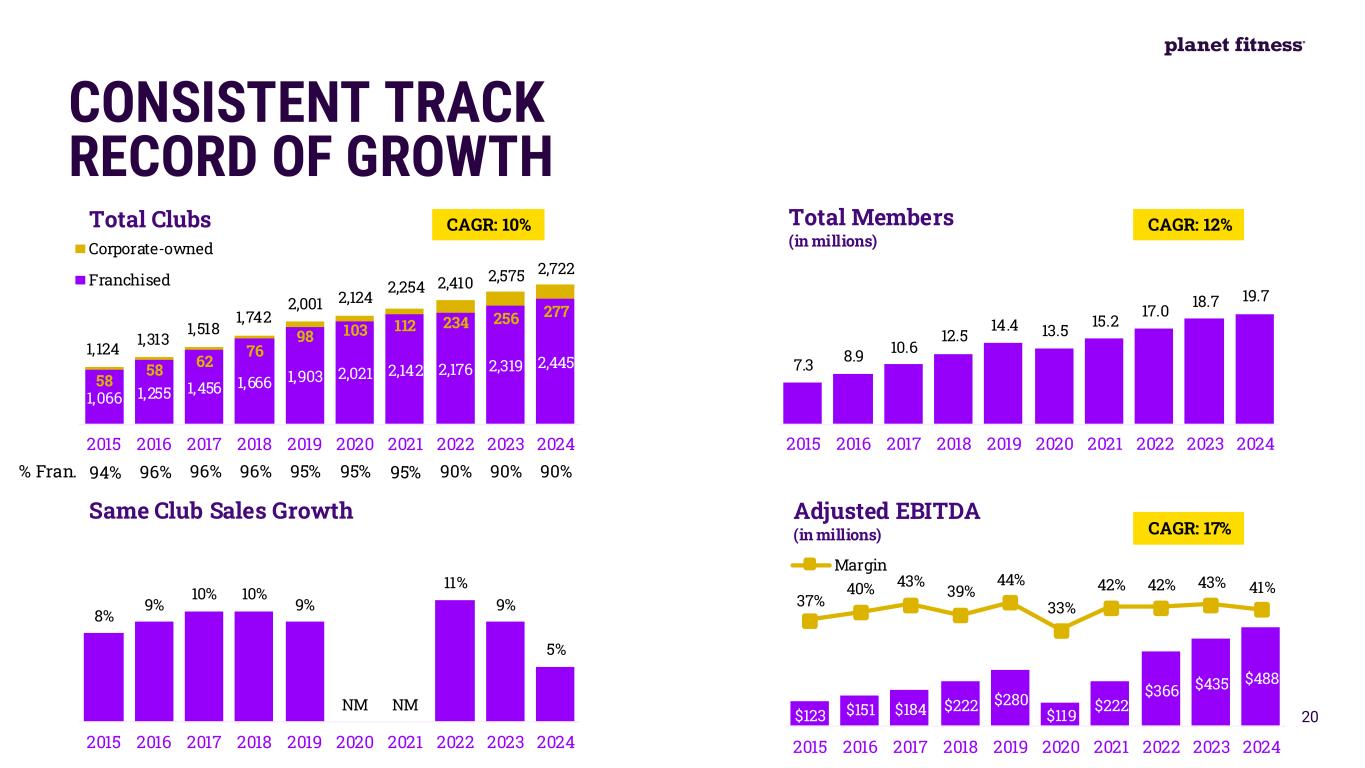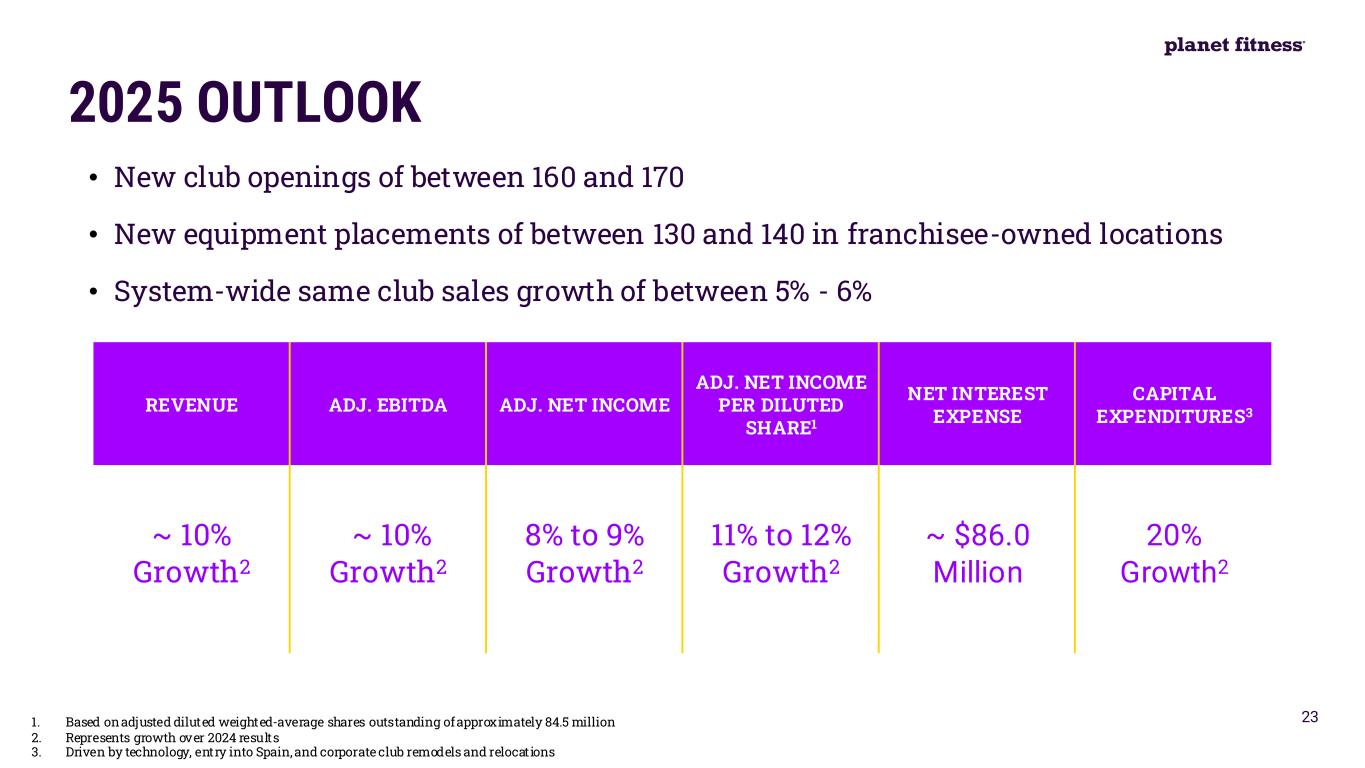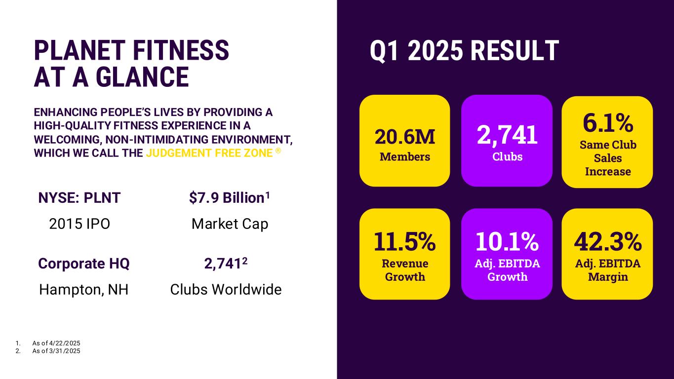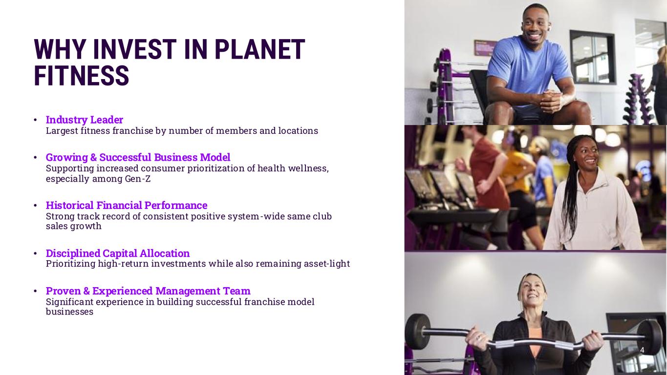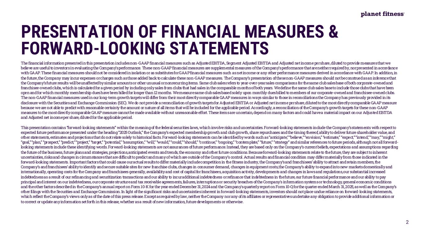 2 PRESENTATION OF FINANCIAL MEASURES & FORWARD-LOOKING STATEMENTS The financial information presented in this presentation includes non-GAAP financial measures such as Adjusted EBITDA, Segment Adjusted EBITDA and Adjusted net income per share,diluted to provide measures that we believe are useful to investors in evaluating the Company’s performance. These non-GAAP financial measures are supplemental measures of the Company’s performance that are neither required by, nor presented in accordance with GAAP. These financial measures should not be considered in isolation or as substitutes for GAAP financial measures such as net income or any other performance measures derived in accordance with GAAP. In addition, in the future, the Company may incur expenses or charges such as those added back to calculate these non-GAAP measures. The Company’s presentation of these non-GAAP measures should not be construed as an inference that the Company’s future results will be unaffected by similar amounts or other unusual or nonrecurring items. Same club sales refers to year-over-year sales comparisons for the same club sales base of both corporate-owned and franchisee-owned clubs, which is calculated for a given period by including only sales from clubs that had sales in the comparable months of both years. We define the same club sales base to include those clubs that have been open and for which monthly membership dues have been billed for longer than 12 months. We measure same club sales based solely upon monthly dues billed to members of our corporate-owned and franchisee-owned clubs. The non-GAAP financial measures used in our long-term growth targets will differ from their most directly comparable GAAP measures in ways similar to those in reconciliations the Company has previously provided in its disclosure with the Securities and Exchange Commission (SEC). We do not provide a reconciliation of growth targets for Adjusted EBITDA or Adjusted net income per share, diluted to the most directly comparable GAAP measure because we are not able to predict with reasonable certainty the amount or nature of all items that will be included for the applicable period. Accordingly, a reconciliation of the Company’s growth targets for these non-GAAP measures to the most directly comparable GAAP measure cannot be made available without unreasonable effort. These items are uncertain, depend on many factors and could have a material impact on our AdjustedEBITDA and Adjusted net income per share, diluted for the applicable period. This presentation contains “forward-looking statements” within the meaning of the federal securities laws, which involve risks and uncertainties. Forward-looking statements include the Company’s statements with respect to expected future performance presented under the heading “2025 Outlook,” the Company’s expected membership growth and club growth, share repurchases and the timing thereof, ability to deliver future shareholder value, and other statements, estimates and projections that do not relate solely to historical facts. Forward-looking statements can be identified by words such as “anticipate,” “believe,” “envision,” “estimate,” “expect,” “intend,” “may,” “might,” “goal,” “plan,” “prospect,” “predict,” “project,” “target,” “potential,” “assumption,” “will,” “would,” “could,” “should,” “continue,” “ongoing,” “contemplate,” “future,” “strategy” and similar references to future periods, although not all forward- looking statements include these identifying words. Forward-looking statements are not assurances of future performance. Instead, they are based only on the Company’s current beliefs, expectations and assumptions regarding the future of the business, future plans and strategies, projections, anticipated events and trends, the economy and other future conditions. Because forward-looking statements relate to the future, they are subject to inherent uncertainties, risks and changes in circumstances that are difficult to predict and many of which are outside of the Company’s control. Actual results and financial condition may differ materially from those indicated in the forward-looking statements. Important factors that could cause our actual results to differ materially include competition in the fitness industry, the Company’s and franchisees’ ability to attract and retain members, the Company’s and franchisees’ ability to identify and secure suitable sites for new franchise clubs, changes in consumer demand, changes in equipment costs, the Company’s ability to expand into new markets domestically and internationally, operating costs for the Company and franchisees generally, availability and cost of capital for franchisees, acquisition activity, developments and changes in laws and regulations, our substantial increased indebtedness as a result of our refinancing and securitization transactions and our ability to incur additional indebtedness or refinance that indebtedness in the future, our future financial performance and our ability to pay principal and interest on our indebtedness, our corporate structure and tax receivable agreements, failures, interruptions or security breaches of the Company's information systems or technology, general economic conditions and the other factors described in the Company’s annual report on Form 10-K for the year ended December 31, 2024 and the Company's quarterly report on Form 10-Q for the quarter ended March 31, 2025, as well as the Company’s other filings with the Securities and Exchange Commission. In light of the significant risks and uncertainties inherent in forward-looking statements, investors should not place undue reliance on forward-looking statements, which reflect the Company’s views only as of the date of this press release. Except as required by law, neither the Company nor any of its