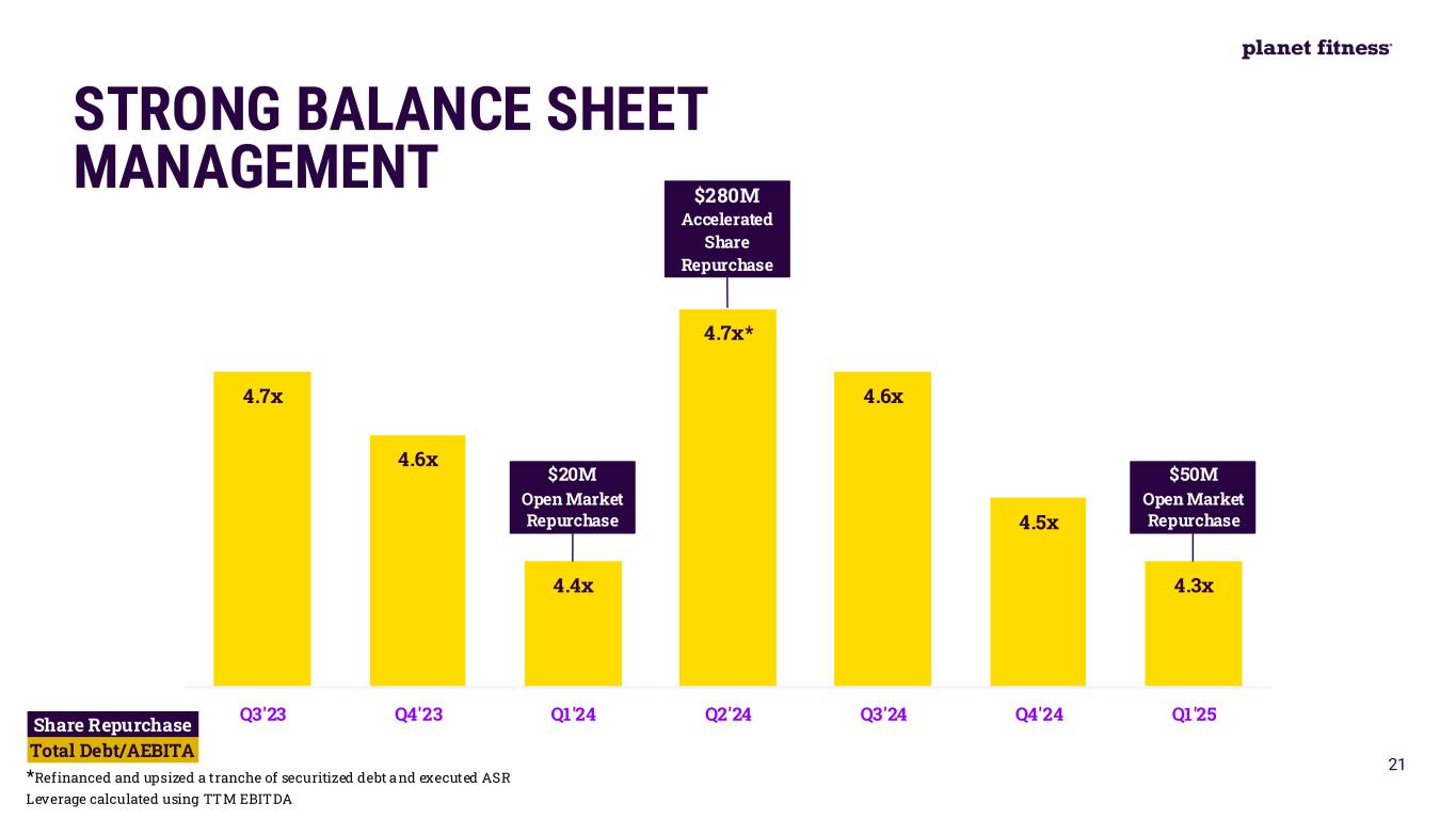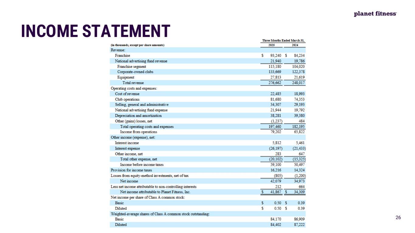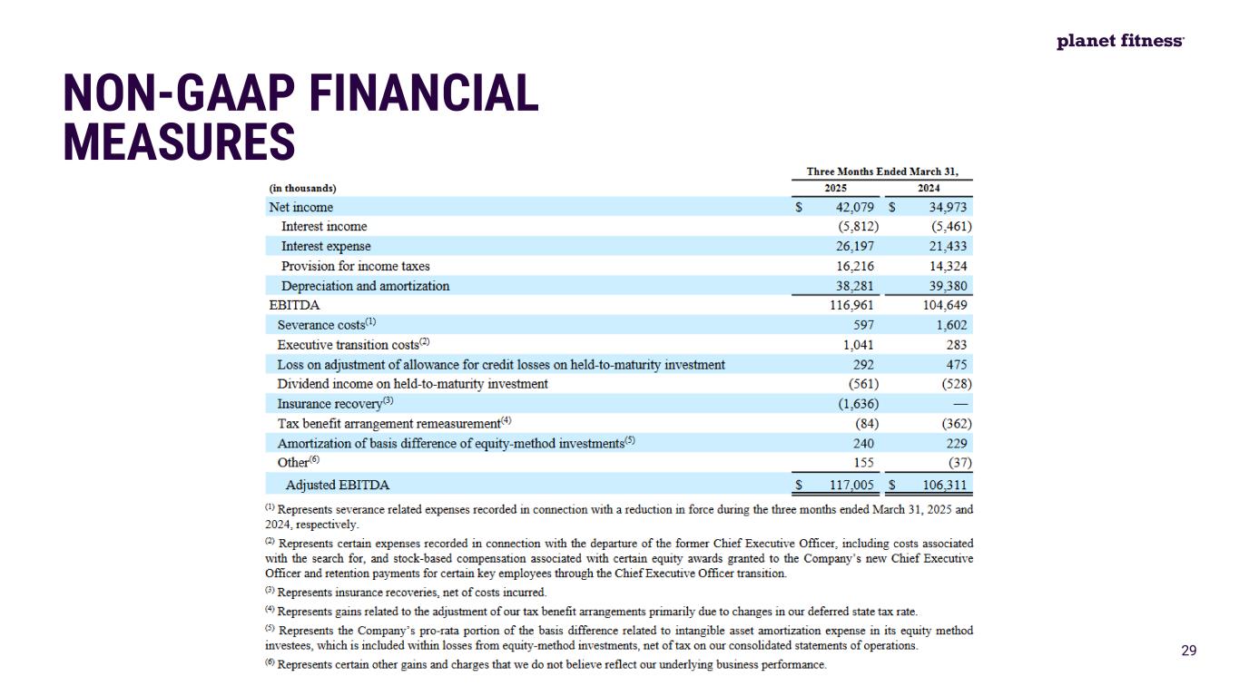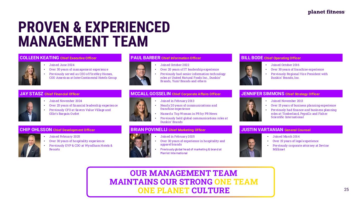 2 PRESENTATION OF FINANCIAL MEASURES & FORWARD-LOOKING STATEMENTS The financial information presented in this presentation includes non-GAAP financial measures such as Adjusted EBITDA, Segment Adjusted EBITDA and Adjusted net income per share,diluted to provide measures that we believe are useful to investors in evaluating the Company’s performance. These non-GAAP financial measures are supplemental measures of the Company’s performance that are neither required by, nor presented in accordance with GAAP. These financial measures should not be considered in isolation or as substitutes for GAAP financial measures such as net income or any other performance measures derived in accordance with GAAP. In addition, in the future, the Company may incur expenses or charges such as those added back to calculate these non-GAAP measures. The Company’s presentation of these non-GAAP measures should not be construed as an inference that the Company’s future results will be unaffected by similar amounts or other unusual or nonrecurring items. Same club sales refers to year-over-year sales comparisons for the same club sales base of both corporate-owned and franchisee-owned clubs, which is calculated for a given period by including only sales from clubs that had sales in the comparable months of both years. We define the same club sales base to include those clubs that have been open and for which monthly membership dues have been billed for longer than 12 months. We measure same club sales based solely upon monthly dues billed to members of our corporate-owned and franchisee-owned clubs. The non-GAAP financial measures used in our long-term growth targets will differ from their most directly comparable GAAP measures in ways similar to those in reconciliations the Company has previously provided in its disclosure with the Securities and Exchange Commission (SEC). We do not provide a reconciliation of growth targets for Adjusted EBITDA or Adjusted net income per share, diluted to the most directly comparable GAAP measure because we are not able to predict with reasonable certainty the amount or nature of all items that will be included for the applicable period. Accordingly, a reconciliation of the Company’s growth targets for these non-GAAP measures to the most directly comparable GAAP measure cannot be made available without unreasonable effort. These items are uncertain, depend on many factors and could have a material impact on our AdjustedEBITDA and Adjusted net income per share, diluted for the applicable period. This presentation contains “forward-looking statements” within the meaning of the federal securities laws, which involve risks and uncertainties. Forward-looking statements include the Company’s statements with respect to expected future performance presented under the heading “2025 Outlook,” the Company’s expected membership growth and club growth, share repurchases and the timing thereof, ability to deliver future shareholder value, and other statements, estimates and projections that do not relate solely to historical facts. Forward-looking statements can be identified by words such as “anticipate,” “believe,” “envision,” “estimate,” “expect,” “intend,” “may,” “might,” “goal,” “plan,” “prospect,” “predict,” “project,” “target,” “potential,” “assumption,” “will,” “would,” “could,” “should,” “continue,” “ongoing,” “contemplate,” “future,” “strategy” and similar references to future periods, although not all forward- looking statements include these identifying words. Forward-looking statements are not assurances of future performance. Instead, they are based only on the Company’s current beliefs, expectations and assumptions regarding the future of the business, future plans and strategies, projections, anticipated events and trends, the economy and other future conditions. Because forward-looking statements relate to the future, they are subject to inherent uncertainties, risks and changes in circumstances that are difficult to predict and many of which are outside of the Company’s control. Actual results and financial condition may differ materially from those indicated in the forward-looking statements. Important factors that could cause our actual results to differ materially include competition in the fitness industry, the Company’s and franchisees’ ability to attract and retain members, the Company’s and franchisees’ ability to identify and secure suitable sites for new franchise clubs, changes in consumer demand, changes in equipment costs, the Company’s ability to expand into new markets domestically and internationally, operating costs for the Company and franchisees generally, availability and cost of capital for franchisees, acquisition activity, developments and changes in laws and regulations, our substantial increased indebtedness as a result of our refinancing and securitization transactions and our ability to incur additional indebtedness or refinance that indebtedness in the future, our future financial performance and our ability to pay principal and interest on our indebtedness, our corporate structure and tax receivable agreements, failures, interruptions or security breaches of the Company's information systems or technology, general economic conditions and the other factors described in the Company’s annual report on Form 10-K for the year ended December 31, 2024 and the Company's quarterly report on Form 10-Q for the quarter ended March 31, 2025, as well as the Company’s other filings with the Securities and Exchange Commission. In light of the significant risks and uncertainties inherent in forward-looking statements, investors should not place undue reliance on forward-looking statements, which reflect the Company’s views only as of the date of this press release. Except as required by law, neither the Company nor any of its