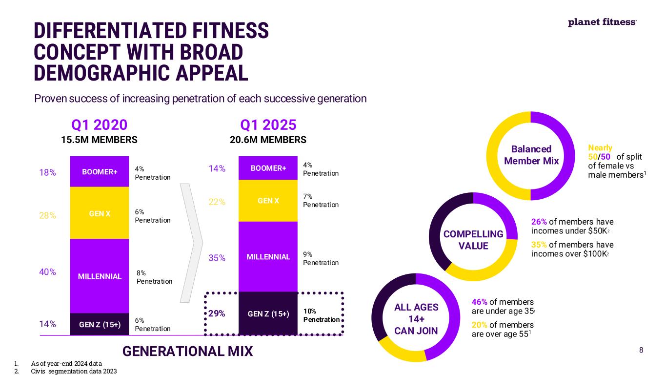 7 2,741 Clubs1 483 198 7433 PLNT 2nd Largest 3rd Largest All Others HVLP Landscape SIGNIFICANT SIZE & SCALE ADVANTAGE Clubs & Membership Marketing 6.6x the number of members of closest competitor • More than $1B2 spend on marketing systemwide since 2015 IPO • Spent over $330M in systemwide marketing 2024 • #1 in aided/unaided brand awareness4 1. As of 3/31/2025 2. As of 12/31/2024 3. Next 16 largest U.S. gym concept peers as tracked by Vivixx and Pathmatic 4. PF Brand Health, Magid Research, Winter 2023
