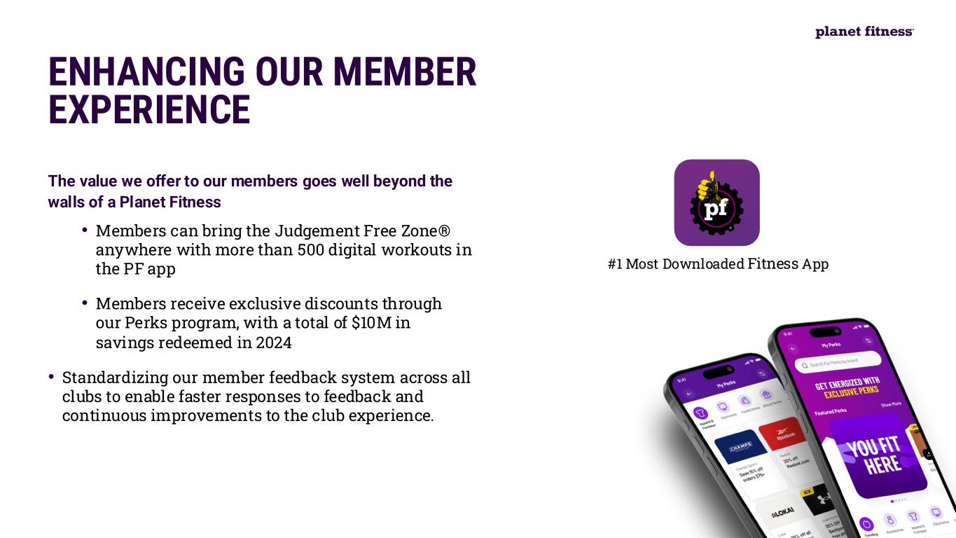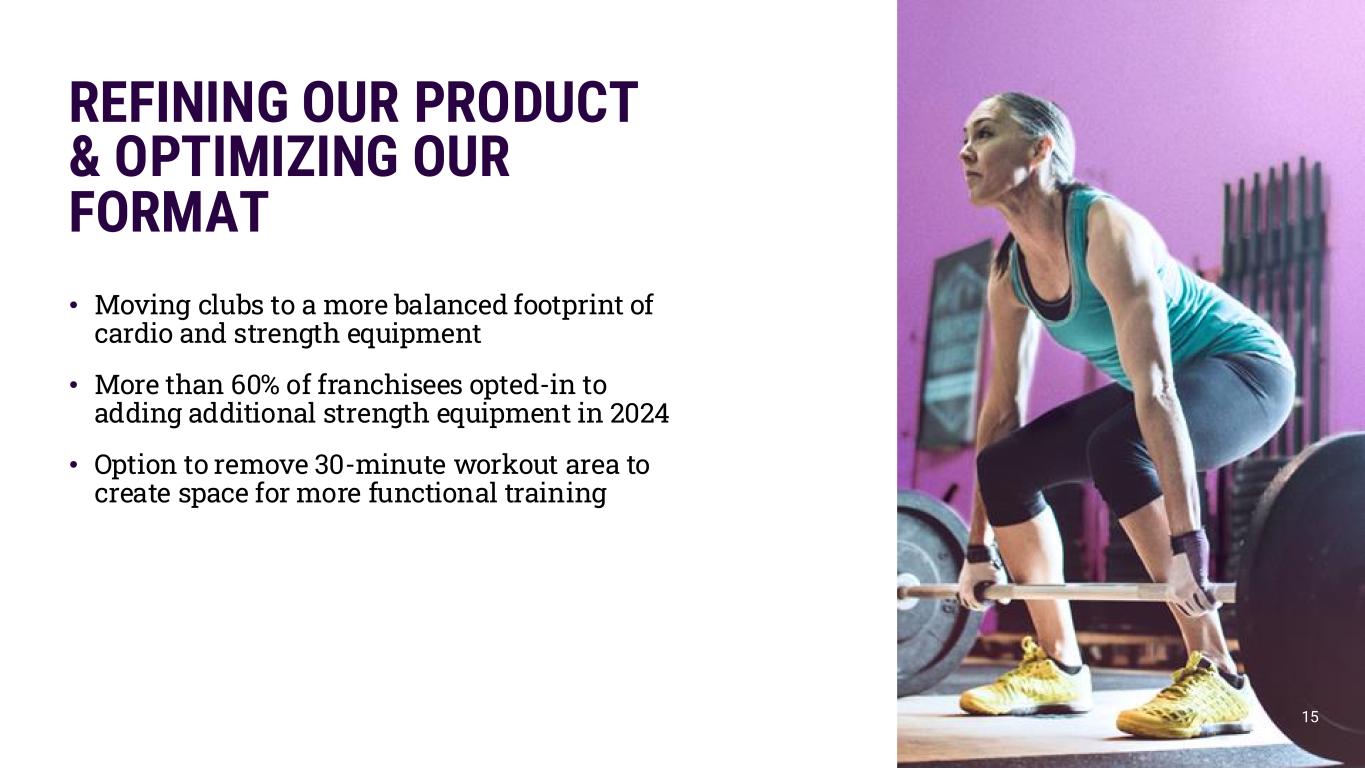 14 ENHANCING OUR MEMBER EXPERIENCE The value we offer to our members goes well beyond the walls of a Planet Fitness • Members can bring the Judgement Free Zone® anywhere with more than 500 digital workouts in the PF app • Members receive exclusive discounts through our Perks program, with a total of $10M in savings redeemed in 2024 • Standardizing our member feedback system across all clubs to enable faster responses to feedback and continuous improvements to the club experience. #1 Most Downloaded Fitness App