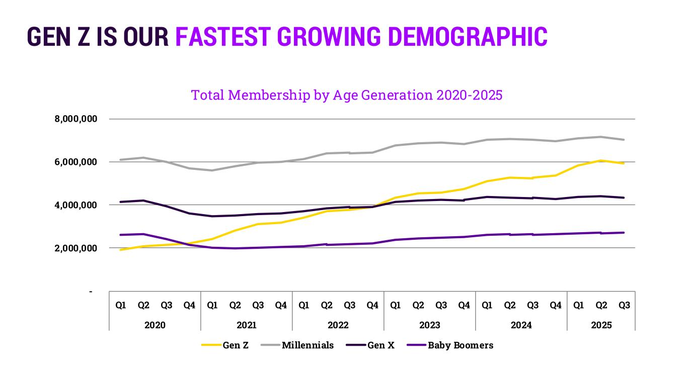 GEN Z IS OUR FASTEST GROWING DEMOGRAPHIC - 2,000,000 4,000,000 6,000,000 8,000,000 Q1 Q2 Q3 Q4 Q1 Q2 Q3 Q4 Q1 Q2 Q3 Q4 Q1 Q2 Q3 Q4 Q1 Q2 Q3 Q4 Q1 Q2 Q3 2020 2021 2022 2023 2024 2025 Total Membership by Age Generation 2020-2025 Gen Z Millennials Gen X Baby Boomers