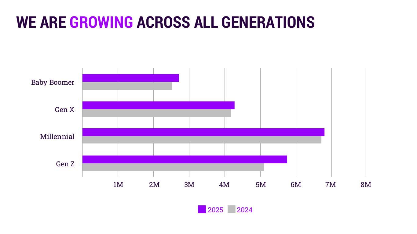 WE ARE GROWING ACROSS ALL GENERATIONS 2025 2024 Baby Boomer Gen X Millennial Gen Z 1M 2M 3M 4M 5M 6M 7M 8M
