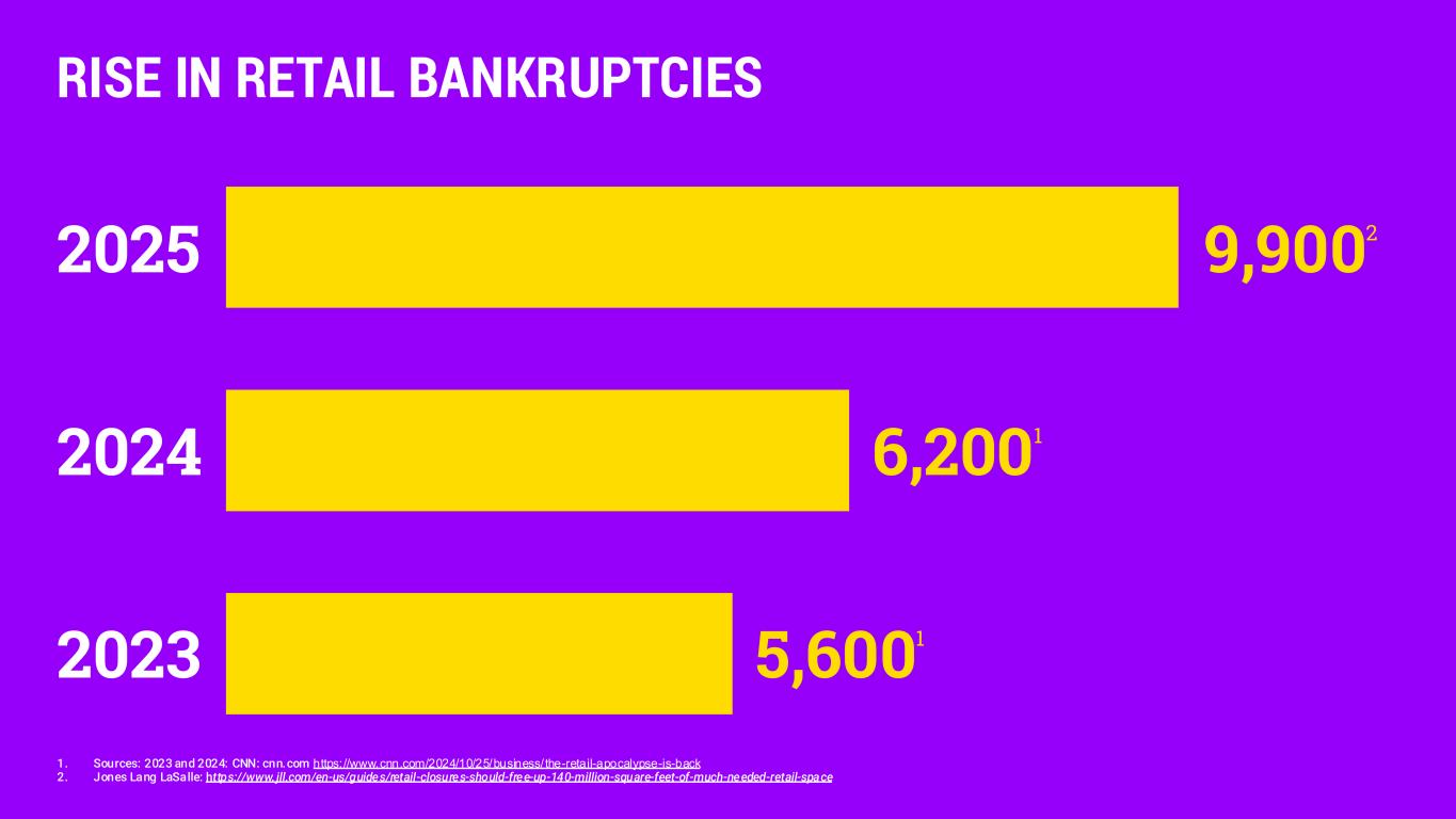 RISE IN RETAIL BANKRUPTCIES 5,6001 6,2001 9,9002 2023 2024 2025 1. Sources: 2023 and 2024: CNN: cnn.com https://www.cnn.com/2024/10/25/business/the-retail-apocalypse-is-back 2. Jones Lang LaSalle: https://www.jll.com/en-us/guides/retail-closures-should-free-up-140-million-square-feet-of-much-needed-retail-space