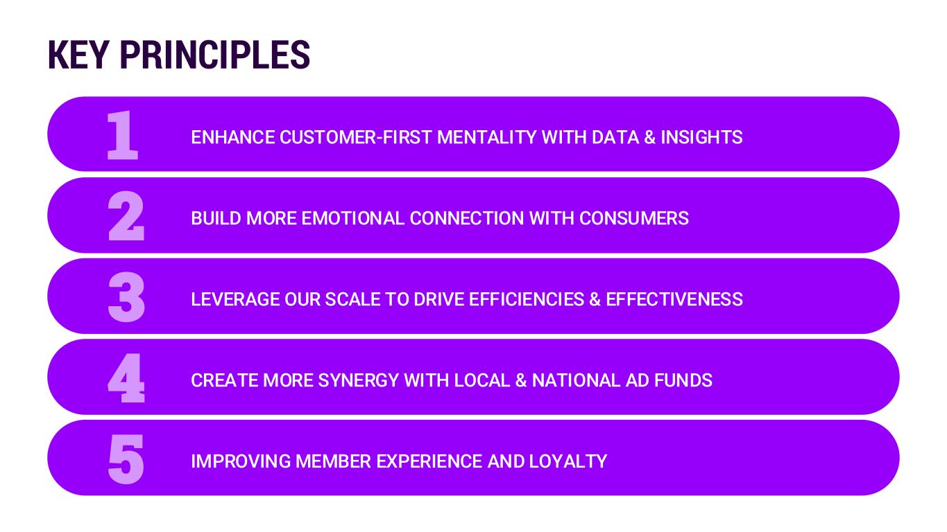 KEY PRINCIPLES ENHANCE CUSTOMER-FIRST MENTALITY WITH DATA & INSIGHTS1 1 BUILD MORE EMOTIONAL CONNECTION WITH CONSUMERS2 LEVERAGE OUR SCALE TO DRIVE EFFICIENCIES & EFFECTIVENESS3 CREATE MORE SYNERGY WITH LOCAL & NATIONAL AD FUNDS4 IMPROVING MEMBER EXPERIENCE AND LOYALTY5