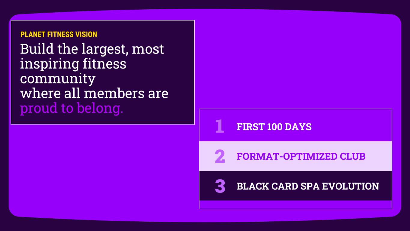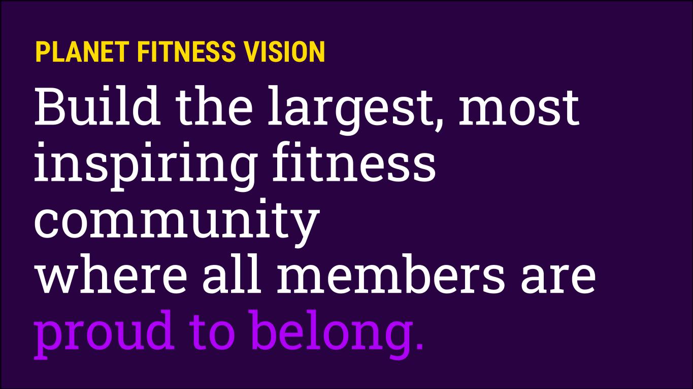 Build the largest, most inspiring fitness community where all members are proud to belong. PLANET FITNESS VISION