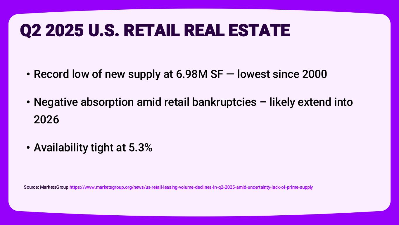 • Record low of new supply at 6.98M SF — lowest since 2000 • Negative absorption amid retail bankruptcies – likely extend into 2026 • Availability tight at 5.3% Source: MarketsGroup https://www.marketsgroup.org/news/us-retail-leasing-volume-declines-in-q2-2025-amid-uncertainty-lack-of-prime-supply Q2 2025 U.S. RETAIL REAL ESTATE