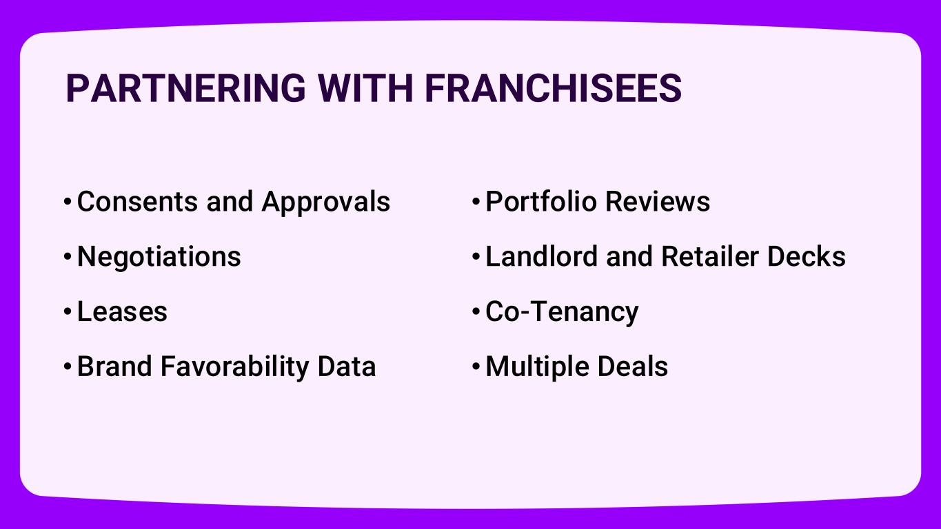 •Consents and Approvals •Negotiations •Leases •Brand Favorability Data •Portfolio Reviews •Landlord and Retailer Decks •Co-Tenancy •Multiple Deals PARTNERING WITH FRANCHISEES
