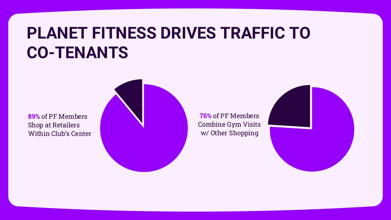 PLANET FITNESS DRIVES TRAFFIC TO CO-TENANTS 76% of PF Members Combine Gym Visits w/ Other Shopping 89% of PF Members Shop at Retailers Within Club’s Center