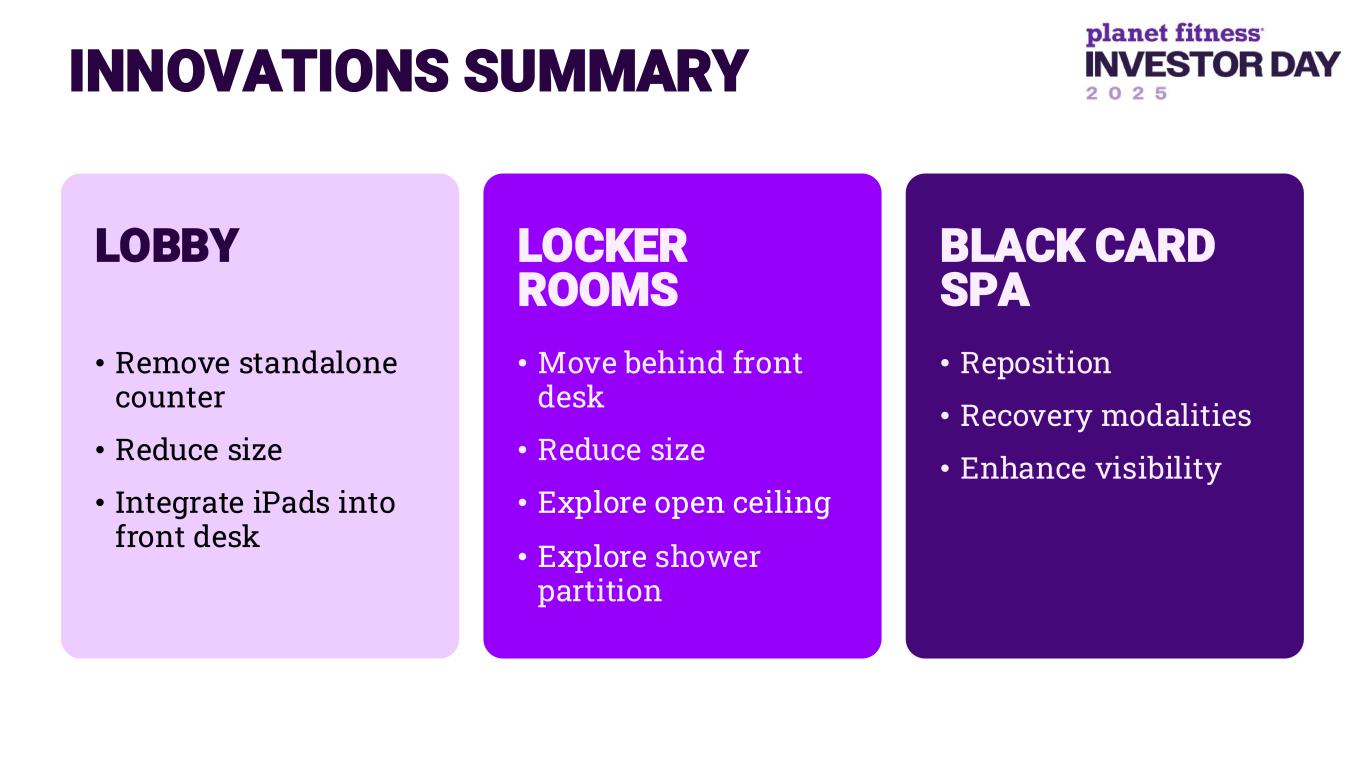 INNOVATIONS SUMMARY • Remove standalone counter • Reduce size • Integrate iPads into front desk LOBBY • Move behind front desk • Reduce size • Explore open ceiling • Explore shower partition LOCKER ROOMS • Reposition • Recovery modalities • Enhance visibility BLACK CARD SPA Correct