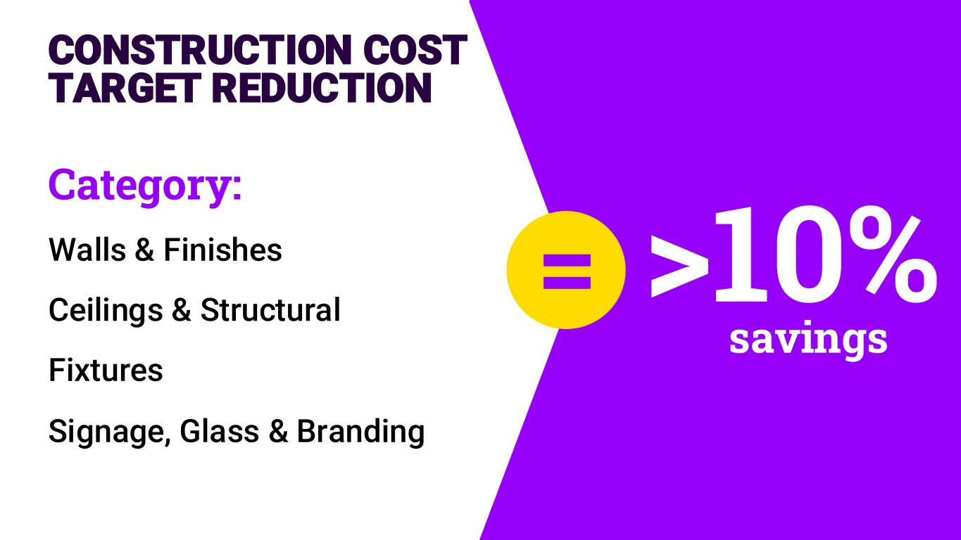 CONSTRUCTION COST TARGET REDUCTION >10% savings Category: Walls & Finishes Ceilings & Structural Fixtures Signage, Glass & Branding =