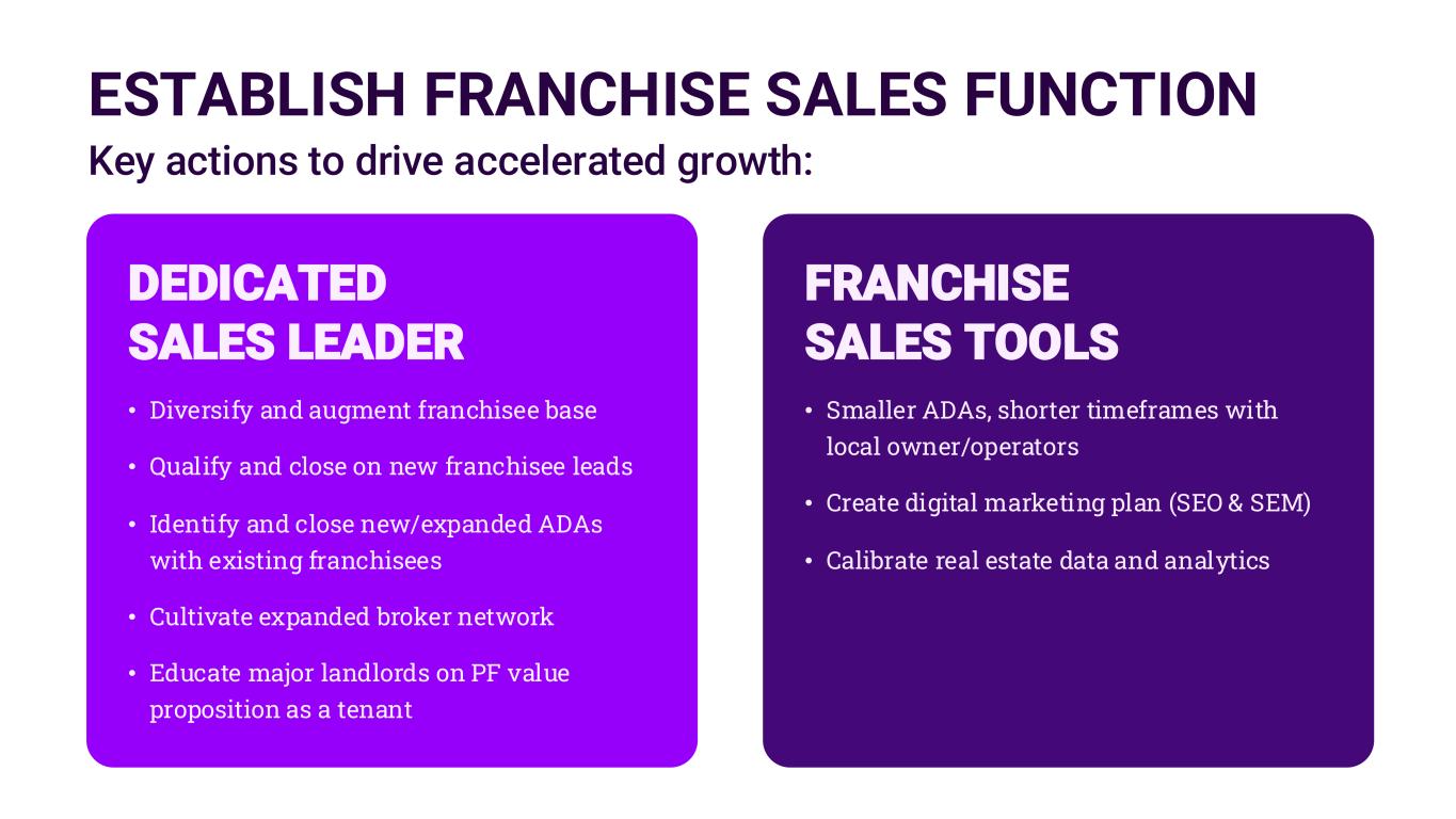 ESTABLISH FRANCHISE SALES FUNCTION Key actions to drive accelerated growth: • Smaller ADAs, shorter timeframes with local owner/operators • Create digital marketing plan (SEO & SEM) • Calibrate real estate data and analytics FRANCHISE SALES TOOLS • Diversify and augment franchisee base • Qualify and close on new franchisee leads • Identify and close new/expanded ADAs with existing franchisees • Cultivate expanded broker network • Educate major landlords on PF value proposition as a tenant DEDICATED SALES LEADER