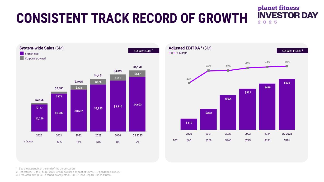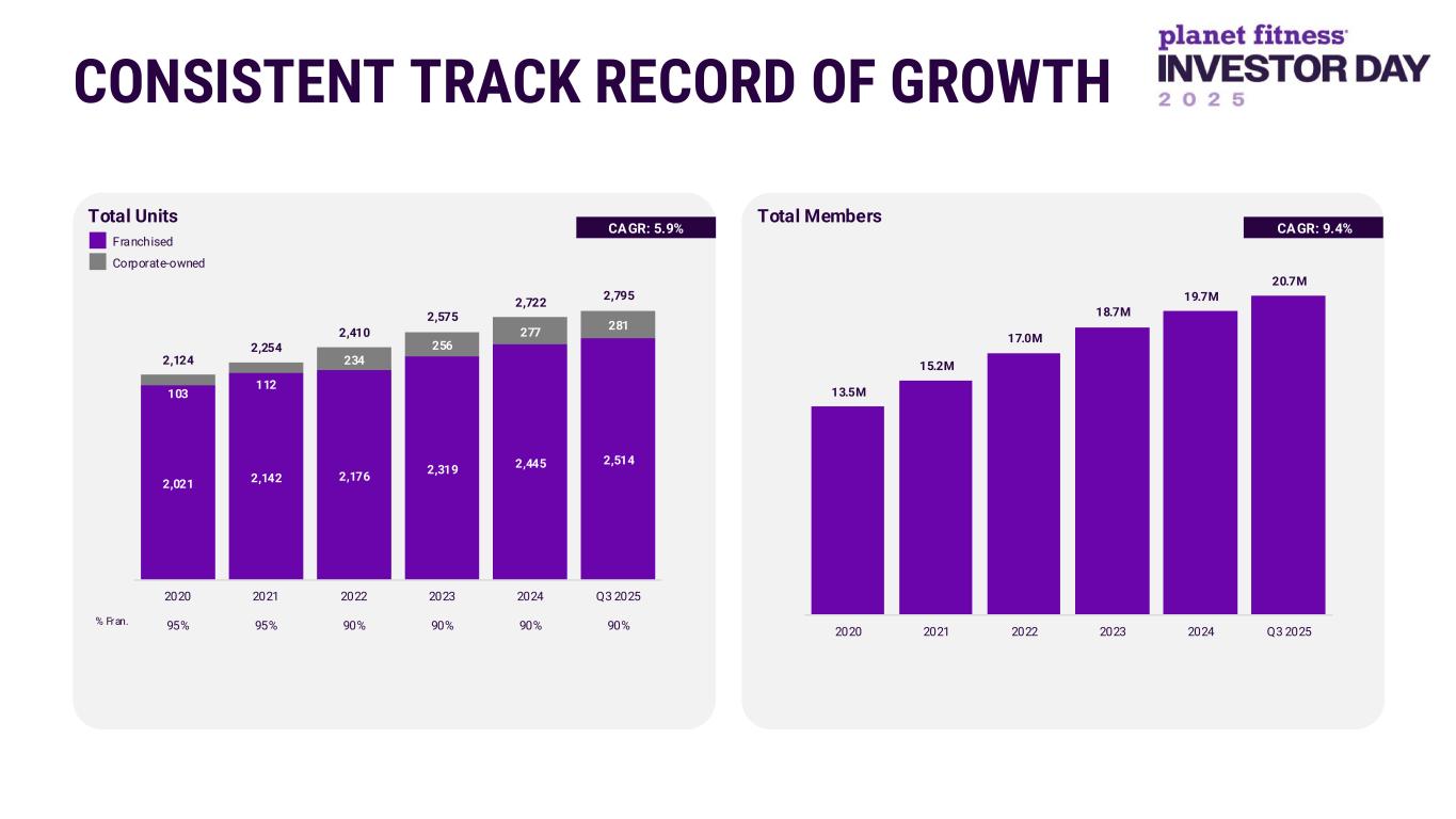 Total Units Total Members CAGR: 5.9% CAGR: 9.4% Franchised Corporate-owned % Fran. CONSISTENT TRACK RECORD OF GROWTH 2,021 2,142 2,176 2,319 2,445 2,514 103 112 234 256 277 281 2,124 2,254 2,410 2,575 2,722 2,795 2020 95% 2021 95% 2022 90% 2023 90% 2024 90% Q3 2025 90% 13.5M 15.2M 17.0M 18.7M 19.7M 20.7M 2020 2021 2022 2023 2024 Q3 2025
