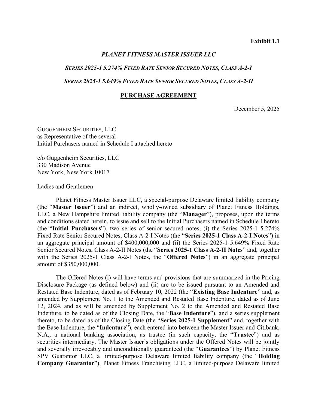 Exhibit 1.1 PLANET FITNESS MASTER ISSUER LLC SERIES 2025-1 5.274% FIXED RATE SENIOR SECURED NOTES, CLASS A-2-I SERIES 2025-1 5.649% FIXED RATE SENIOR SECURED NOTES, CLASS A-2-II PURCHASE AGREEMENT December 5, 2025 GUGGENHEIM SECURITIES, LLC as Representative of the several Initial Purchasers named in Schedule I attached hereto c/o Guggenheim Securities, LLC 330 Madison Avenue New York, New York 10017 Ladies and Gentlemen: Planet Fitness Master Issuer LLC, a special-purpose Delaware limited liability company (the “Master Issuer”) and an indirect, wholly-owned subsidiary of Planet Fitness Holdings, LLC, a New Hampshire limited liability company (the “Manager”), proposes, upon the terms and conditions stated herein, to issue and sell to the Initial Purchasers named in Schedule I hereto (the “Initial Purchasers”), two series of senior secured notes, (i) the Series 2025-1 5.274% Fixed Rate Senior Secured Notes, Class A-2-I Notes (the “Series 2025-1 Class A-2-I Notes”) in an aggregate principal amount of $400,000,000 and (ii) the Series 2025-1 5.649% Fixed Rate Senior Secured Notes, Class A-2-II Notes (the “Series 2025-1 Class A-2-II Notes” and, together with the Series 2025-1 Class A-2-I Notes, the “Offered Notes”) in an aggregate principal amount of $350,000,000. The Offered Notes (i) will have terms and provisions that are summarized in the Pricing Disclosure Package (as defined below) and (ii) are to be issued pursuant to an Amended and Restated Base Indenture, dated as of February 10, 2022 (the “Existing Base Indenture” and, as amended by Supplement No. 1 to the Amended and Restated Base Indenture, dated as of June 12, 2024, and as will be amended by Supplement No. 2 to the Amended and Restated Base Indenture, to be dated as of the Closing Date, the “Base Indenture”), and a series supplement thereto, to be dated as of the Closing Date (the “Series 2025-1 Supplement” and, together with the Base Indenture, the “Indenture”), each entered into between the Master Issuer and Citibank, N.A., a national banking association, as trustee (in such capacity, the “Trustee”) and as securities intermediary. The Master Issuer’s obligations under the Offered Notes will be jointly and severally irrevocably and unconditionally guaranteed (the “Guarantees”) by Planet Fitness SPV Guarantor LLC, a limited-purpose Delaware limited liability company (the “Holding Company Guarantor”), Planet Fitness Franchising LLC, a limited-purpose Delaware limited