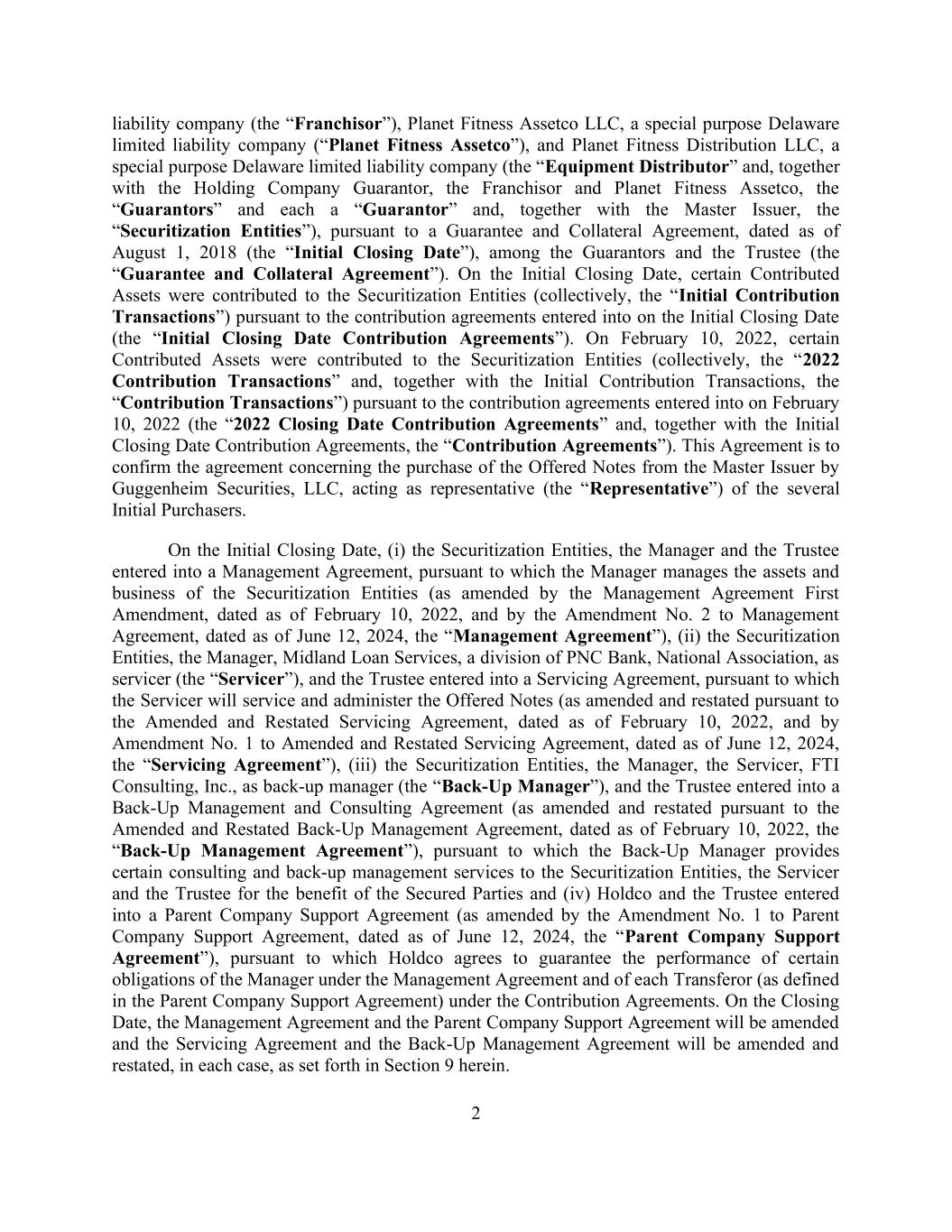 2 liability company (the “Franchisor”), Planet Fitness Assetco LLC, a special purpose Delaware limited liability company (“Planet Fitness Assetco”), and Planet Fitness Distribution LLC, a special purpose Delaware limited liability company (the “Equipment Distributor” and, together with the Holding Company Guarantor, the Franchisor and Planet Fitness Assetco, the “Guarantors” and each a “Guarantor” and, together with the Master Issuer, the “Securitization Entities”), pursuant to a Guarantee and Collateral Agreement, dated as of August 1, 2018 (the “Initial Closing Date”), among the Guarantors and the Trustee (the “Guarantee and Collateral Agreement”). On the Initial Closing Date, certain Contributed Assets were contributed to the Securitization Entities (collectively, the “Initial Contribution Transactions”) pursuant to the contribution agreements entered into on the Initial Closing Date (the “Initial Closing Date Contribution Agreements”). On February 10, 2022, certain Contributed Assets were contributed to the Securitization Entities (collectively, the “2022 Contribution Transactions” and, together with the Initial Contribution Transactions, the “Contribution Transactions”) pursuant to the contribution agreements entered into on February 10, 2022 (the “2022 Closing Date Contribution Agreements” and, together with the Initial Closing Date Contribution Agreements, the “Contribution Agreements”). This Agreement is to confirm the agreement concerning the purchase of the Offered Notes from the Master Issuer by Guggenheim Securities, LLC, acting as representative (the “Representative”) of the several Initial Purchasers. On the Initial Closing Date, (i) the Securitization Entities, the Manager and the Trustee entered into a Management Agreement, pursuant to which the Manager manages the assets and business of the Securitization Entities (as amended by the Management Agreement First Amendment, dated as of February 10, 2022, and by the Amendment No. 2 to Management Agreement, dated as of June 12, 2024, the “Management Agreement”), (ii) the Securitization Entities, the Manager, Midland Loan Services, a division of PNC Bank, National Association, as servicer (the “Servicer”), and the Trustee entered into a Servicing Agreement, pursuant to which the Servicer will service and administer the Offered Notes (as amended and restated pursuant to the Amended and Restated Servicing Agreement, dated as of February 10, 2022, and by Amendment No. 1 to Amended and Restated Servicing Agreement, dated as of June 12, 2024, the “Servicing Agreement”), (iii) the Securitization Entities, the Manager, the Servicer, FTI Consulting, Inc., as back-up manager (the “Back-Up Manager”), and the Trustee entered into a Back-Up Management and Consulting Agreement (as amended and restated pursuant to the Amended and Restated Back-Up Management Agreement, dated as of February 10, 2022, the “Back-Up Management Agreement”), pursuant to which the Back-Up Manager provides certain consulting and back-up management services to the Securitization Entities, the Servicer and the Trustee for the benefit of the Secured Parties and (iv) Holdco and the Trustee entered into a Parent Company Support Agreement (as amended by the Amendment No. 1 to Parent Company Support Agreement, dated as of June 12, 2024, the “Parent Company Support Agreement”), pursuant to which Holdco agrees to guarantee the performance of certain obligations of the Manager under the Management Agreement and of each Transferor (as defined in the Parent Company Support Agreement) under the Contribution Agreements. On the Closing Date, the Management Agreement and the Parent Company Support Agreement will be amended and the Servicing Agreement and the Back-Up Management Agreement will be amended and restated, in each case, as set forth in Section 9 herein.