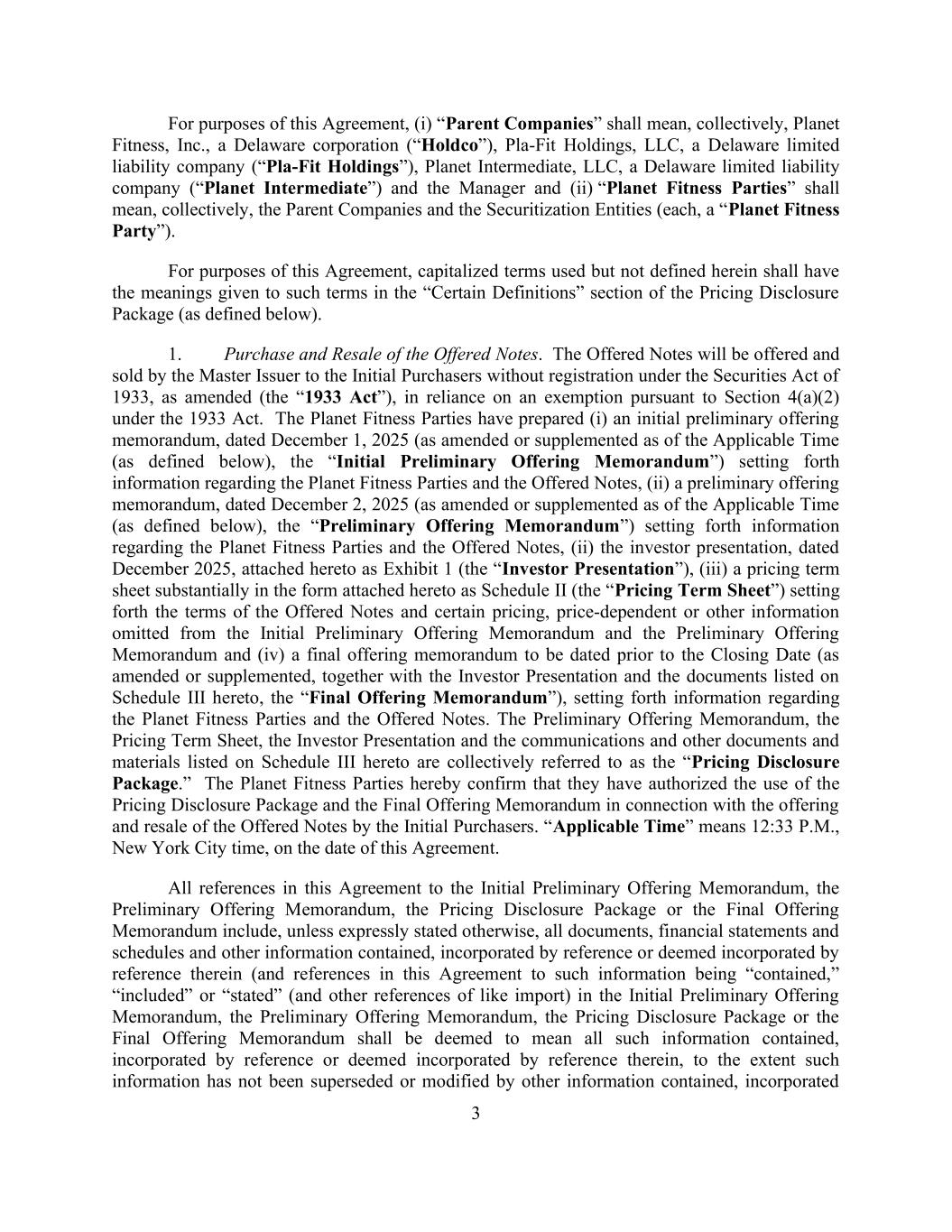 3 For purposes of this Agreement, (i) “Parent Companies” shall mean, collectively, Planet Fitness, Inc., a Delaware corporation (“Holdco”), Pla-Fit Holdings, LLC, a Delaware limited liability company (“Pla-Fit Holdings”), Planet Intermediate, LLC, a Delaware limited liability company (“Planet Intermediate”) and the Manager and (ii) “Planet Fitness Parties” shall mean, collectively, the Parent Companies and the Securitization Entities (each, a “Planet Fitness Party”). For purposes of this Agreement, capitalized terms used but not defined herein shall have the meanings given to such terms in the “Certain Definitions” section of the Pricing Disclosure Package (as defined below). 1. Purchase and Resale of the Offered Notes. The Offered Notes will be offered and sold by the Master Issuer to the Initial Purchasers without registration under the Securities Act of 1933, as amended (the “1933 Act”), in reliance on an exemption pursuant to Section 4(a)(2) under the 1933 Act. The Planet Fitness Parties have prepared (i) an initial preliminary offering memorandum, dated December 1, 2025 (as amended or supplemented as of the Applicable Time (as defined below), the “Initial Preliminary Offering Memorandum”) setting forth information regarding the Planet Fitness Parties and the Offered Notes, (ii) a preliminary offering memorandum, dated December 2, 2025 (as amended or supplemented as of the Applicable Time (as defined below), the “Preliminary Offering Memorandum”) setting forth information regarding the Planet Fitness Parties and the Offered Notes, (ii) the investor presentation, dated December 2025, attached hereto as Exhibit 1 (the “Investor Presentation”), (iii) a pricing term sheet substantially in the form attached hereto as Schedule II (the “Pricing Term Sheet”) setting forth the terms of the Offered Notes and certain pricing, price-dependent or other information omitted from the Initial Preliminary Offering Memorandum and the Preliminary Offering Memorandum and (iv) a final offering memorandum to be dated prior to the Closing Date (as amended or supplemented, together with the Investor Presentation and the documents listed on Schedule III hereto, the “Final Offering Memorandum”), setting forth information regarding the Planet Fitness Parties and the Offered Notes. The Preliminary Offering Memorandum, the Pricing Term Sheet, the Investor Presentation and the communications and other documents and materials listed on Schedule III hereto are collectively referred to as the “Pricing Disclosure Package.” The Planet Fitness Parties hereby confirm that they have authorized the use of the Pricing Disclosure Package and the Final Offering Memorandum in connection with the offering and resale of the Offered Notes by the Initial Purchasers. “Applicable Time” means 12:33 P.M., New York City time, on the date of this Agreement. All references in this Agreement to the Initial Preliminary Offering Memorandum, the Preliminary Offering Memorandum, the Pricing Disclosure Package or the Final Offering Memorandum include, unless expressly stated otherwise, all documents, financial statements and schedules and other information contained, incorporated by reference or deemed incorporated by reference therein (and references in this Agreement to such information being “contained,” “included” or “stated” (and other references of like import) in the Initial Preliminary Offering Memorandum, the Preliminary Offering Memorandum, the Pricing Disclosure Package or the Final Offering Memorandum shall be deemed to mean all such information contained, incorporated by reference or deemed incorporated by reference therein, to the extent such information has not been superseded or modified by other information contained, incorporated