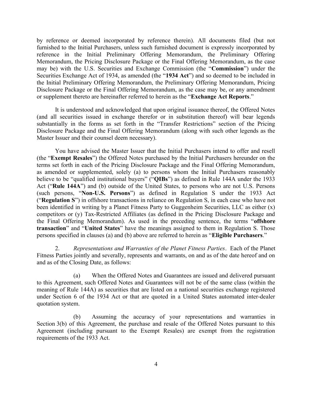 4 by reference or deemed incorporated by reference therein). All documents filed (but not furnished to the Initial Purchasers, unless such furnished document is expressly incorporated by reference in the Initial Preliminary Offering Memorandum, the Preliminary Offering Memorandum, the Pricing Disclosure Package or the Final Offering Memorandum, as the case may be) with the U.S. Securities and Exchange Commission (the “Commission”) under the Securities Exchange Act of 1934, as amended (the “1934 Act”) and so deemed to be included in the Initial Preliminary Offering Memorandum, the Preliminary Offering Memorandum, Pricing Disclosure Package or the Final Offering Memorandum, as the case may be, or any amendment or supplement thereto are hereinafter referred to herein as the “Exchange Act Reports.” It is understood and acknowledged that upon original issuance thereof, the Offered Notes (and all securities issued in exchange therefor or in substitution thereof) will bear legends substantially in the forms as set forth in the “Transfer Restrictions” section of the Pricing Disclosure Package and the Final Offering Memorandum (along with such other legends as the Master Issuer and their counsel deem necessary). You have advised the Master Issuer that the Initial Purchasers intend to offer and resell (the “Exempt Resales”) the Offered Notes purchased by the Initial Purchasers hereunder on the terms set forth in each of the Pricing Disclosure Package and the Final Offering Memorandum, as amended or supplemented, solely (a) to persons whom the Initial Purchasers reasonably believe to be “qualified institutional buyers” (“QIBs”) as defined in Rule 144A under the 1933 Act (“Rule 144A”) and (b) outside of the United States, to persons who are not U.S. Persons (such persons, “Non-U.S. Persons”) as defined in Regulation S under the 1933 Act (“Regulation S”) in offshore transactions in reliance on Regulation S, in each case who have not been identified in writing by a Planet Fitness Party to Guggenheim Securities, LLC as either (x) competitors or (y) Tax-Restricted Affiliates (as defined in the Pricing Disclosure Package and the Final Offering Memorandum). As used in the preceding sentence, the terms “offshore transaction” and “United States” have the meanings assigned to them in Regulation S. Those persons specified in clauses (a) and (b) above are referred to herein as “Eligible Purchasers.” 2. Representations and Warranties of the Planet Fitness Parties. Each of the Planet Fitness Parties jointly and severally, represents and warrants, on and as of the date hereof and on and as of the Closing Date, as follows: (a) When the Offered Notes and Guarantees are issued and delivered pursuant to this Agreement, such Offered Notes and Guarantees will not be of the same class (within the meaning of Rule 144A) as securities that are listed on a national securities exchange registered under Section 6 of the 1934 Act or that are quoted in a United States automated inter-dealer quotation system. (b) Assuming the accuracy of your representations and warranties in Section 3(b) of this Agreement, the purchase and resale of the Offered Notes pursuant to this Agreement (including pursuant to the Exempt Resales) are exempt from the registration requirements of the 1933 Act.